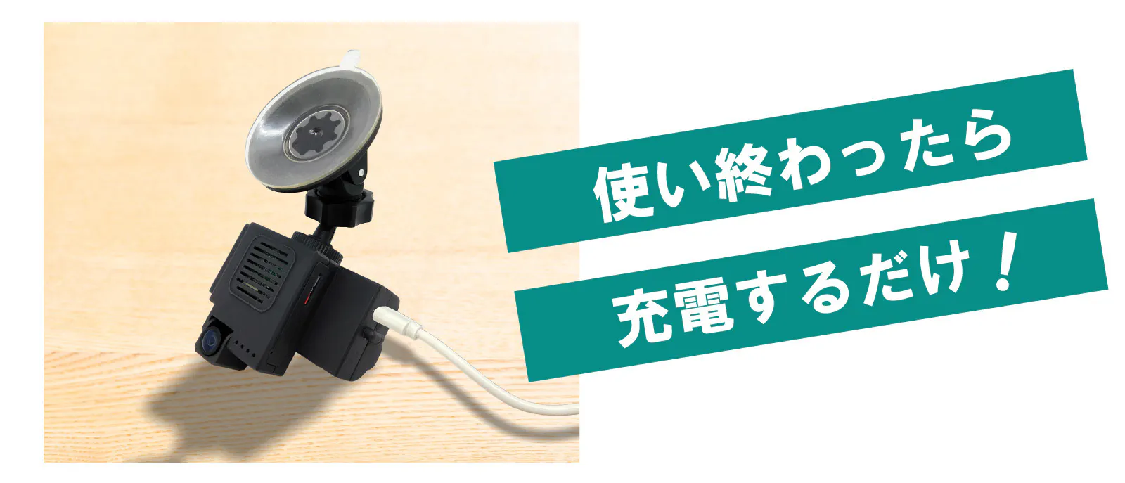 電源・配線不要で持ち運びができ、フロントガラスに吸盤付きスタンドを”ペタッ”と貼り付けただけで使える、小型で軽量の充電式ドラレコができました!