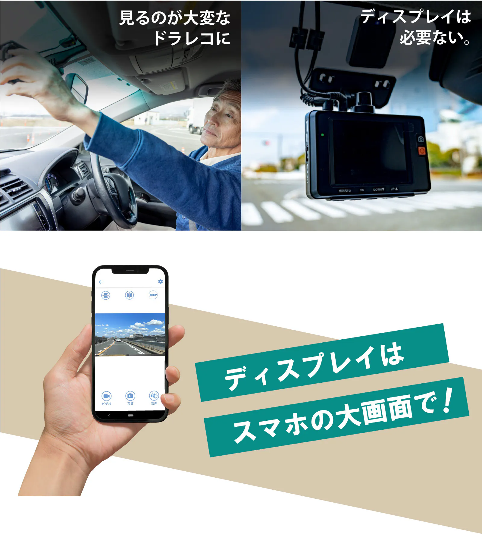 また、走行中の映像の確認はご自身のスマートフォンで行えますので、モニターを必要としません。