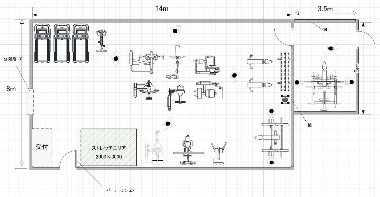 <店内レイアウト:初心者に優しいマシンを揃えています>クラウドファンディングでは事前予約という意味も兼ね、皆様に呼びかけさせていただいていますが、オープン後は完全紹介制となり、見学も会員様のご紹介が必要となります。どなたにでもお試しいただけるお得なプランは今回のクラウドファンディングのみでのご提供となります。