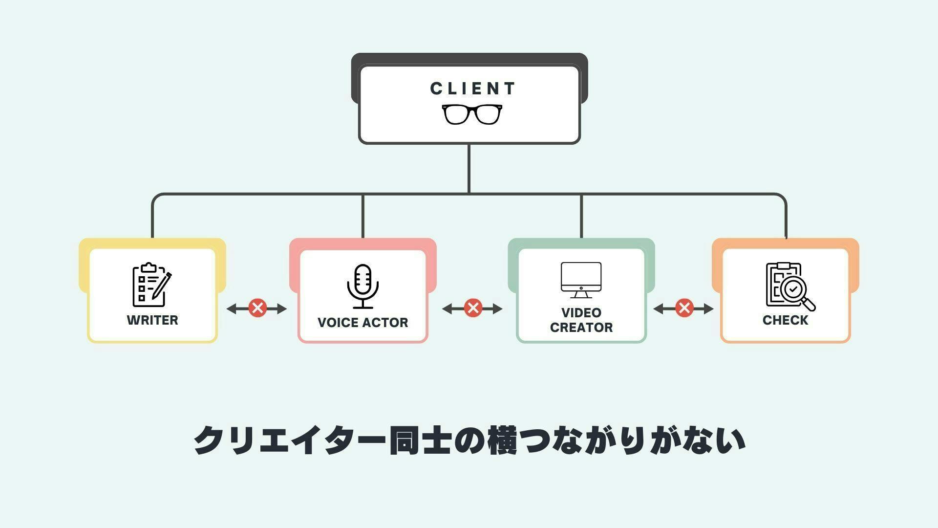 クライアントがライター・声優・動画編集者など、それぞれの担当者に個別に依頼を行うため、お互いの意図を直接共有する機会がなく、作品全体を通した創作の楽しさや一体感を感じにくい というもどかしさがありました。