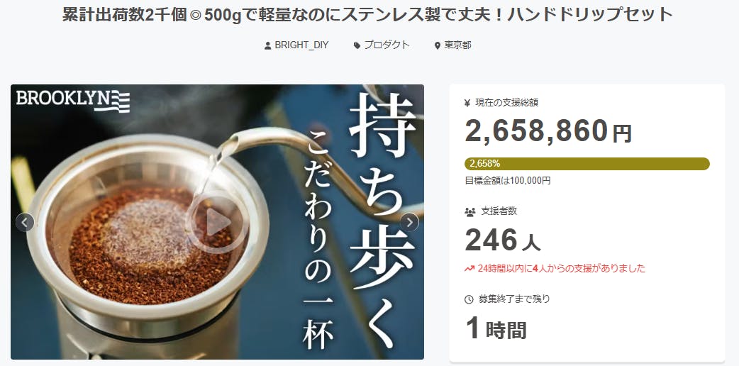 ご支援者、「累計出荷数2千個◎500gで軽量なのにステンレス製で丈夫!ハンドドリップセット」にご興味をお持ちいただきありがとうございます。お陰様で、開始から支援総額265万円達成することができました!終了までわずか1時間となります。コンパクトで軽量な本格ドリップセットは、持ち運びに最適!ステンレス製で頑丈かつ錆びにくいので、アウトドアにもピッタリです。二層式フィルターで紙フィルター不要、コーヒー本来の味わいを最大限に楽しめます!プロジェクト終了後、「BROOKLYN Outdoor Drip Set」をCAMPFIRE特別価格で入手することはできなくなりますので、ご支援がまだの方、追加支援をご検討の方はお急ぎくださいますようお願い申し上げます。\付属品も今ならお得にGET!/【BROOKLYNティースタンダー】33%OFF!!プロジェクト終了後は通常価格&送料がかかります…是非、このお得な機会に付属品もご検討ください。ご興味のある方、ぜひ支援お願い致します。https://camp-fire.jp/projects/801290/viewBrightチームは、当プロジェクトをもっと多くの方に知っていただきたいと考えております。よかったら、FacebookやTwitter等のSNSでのシェア・拡散をお願い致します。#brooklyn #brightdiyどうぞよろしくお願い致します。Brightチーム