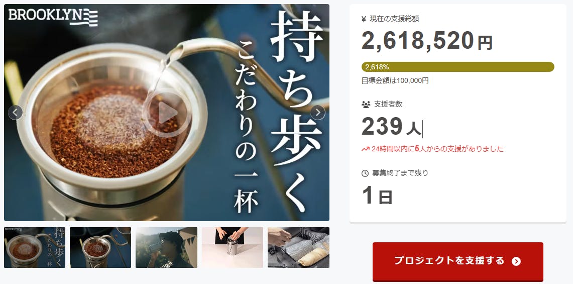 ご支援者、「累計出荷数2千個◎500gで軽量なのにステンレス製で丈夫!ハンドドリップセット」にご興味をお持ちいただきありがとうございます。お陰様で、開始から支援総額265万円達成することができました!終了までわずか1時間となります。コンパクトで軽量な本格ドリップセットは、持ち運びに最適!ステンレス製で頑丈かつ錆びにくいので、アウトドアにもピッタリです。二層式フィルターで紙フィルター不要、コーヒー本来の味わいを最大限に楽しめます!プロジェクト終了後、「BROOKLYN Outdoor Drip Set」をCAMPFIRE特別価格で入手することはできなくなりますので、ご支援がまだの方、追加支援をご検討の方はお急ぎくださいますようお願い申し上げます。\付属品も今ならお得にGET!/【BROOKLYNティースタンダー】33%OFF!!プロジェクト終了後は通常価格&送料がかかります…是非、このお得な機会に付属品もご検討ください。ご興味のある方、ぜひ支援お願い致します。https://camp-fire.jp/projects/801290/viewBrightチームは、当プロジェクトをもっと多くの方に知っていただきたいと考えております。よかったら、FacebookやTwitter等のSNSでのシェア・拡散をお願い致します。#brooklyn #brightdiyどうぞよろしくお願い致します。Brightチーム
