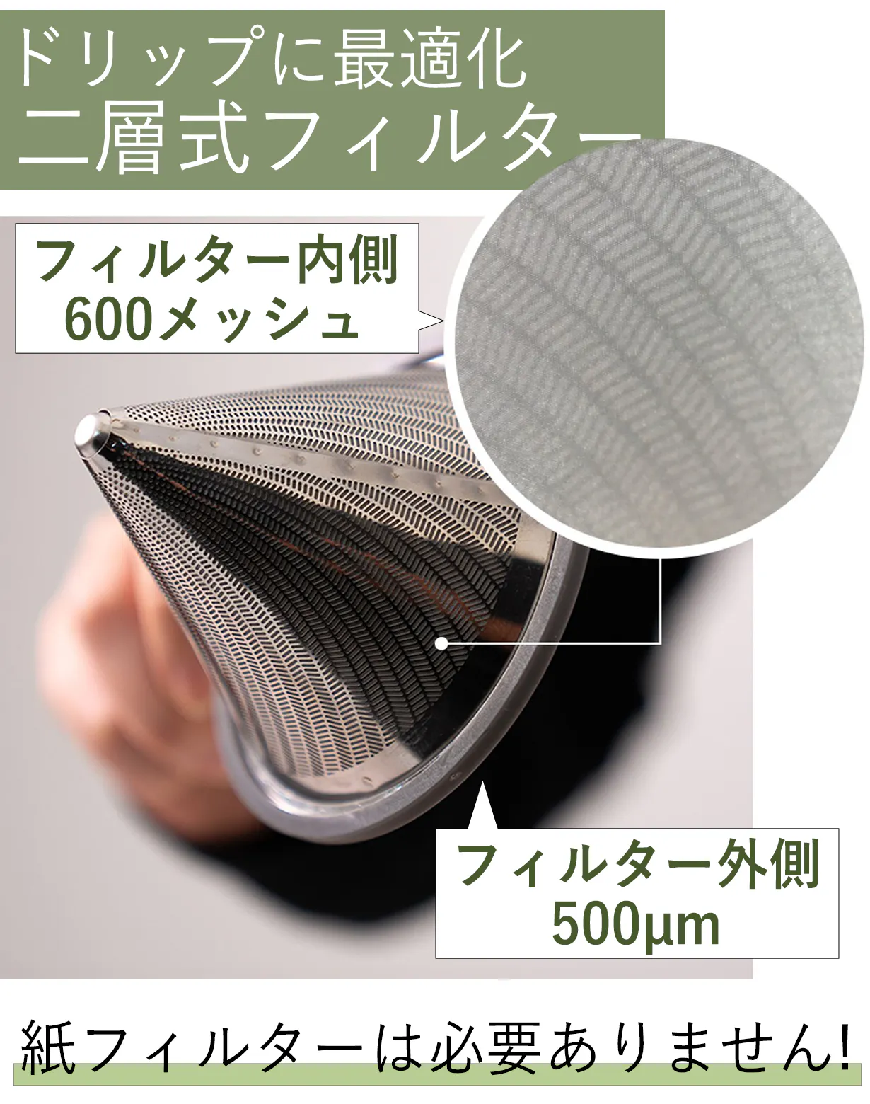 コーヒー本来の風味を楽しめる二層式フィルターを採用!