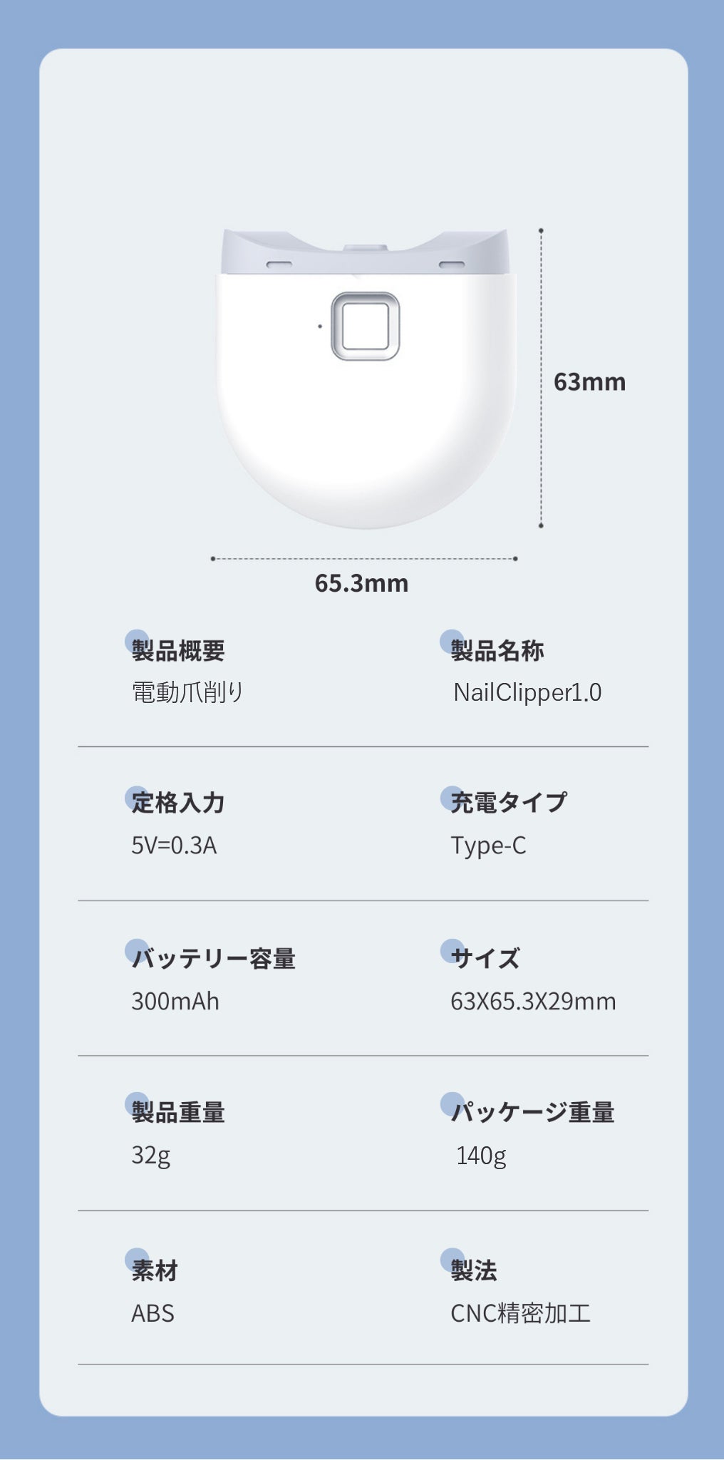Nail Clipper 1.0は1回のフル充電で約3~4時間使用可能です!また、誤作動や消耗防止のために5分作動すると停止してクーリングする機能が備わっています。