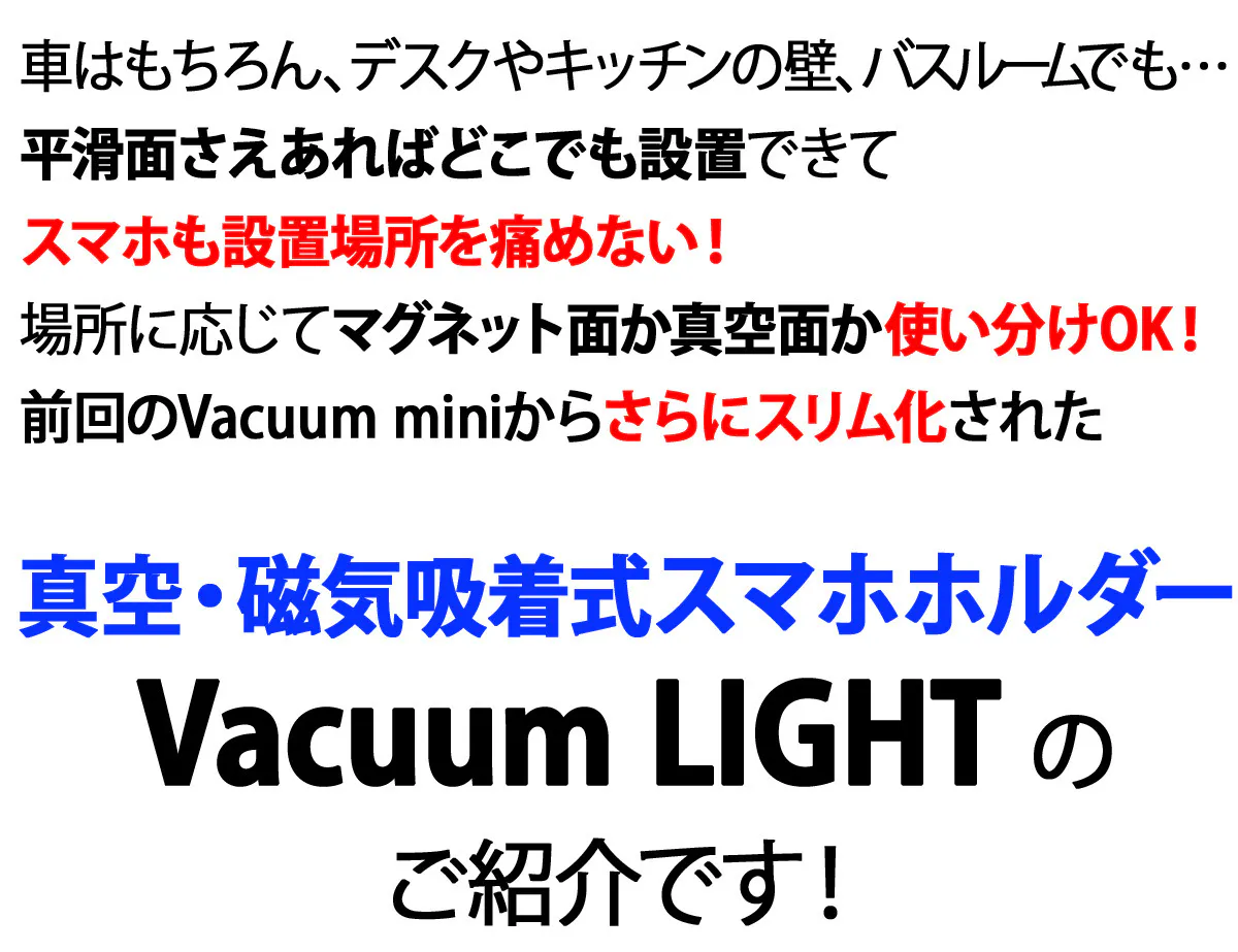 いつも好評をいただいております、Vacuumシリーズからコンパクトな使用感に特化した最新バージョンが開発されました。真空・マグネットで場所を選ばず吸着できるという従来の魅力はそのままにさらに軽量化。これまで以上に持ち運びや外観を損ねない便利なサイズ感になりました。