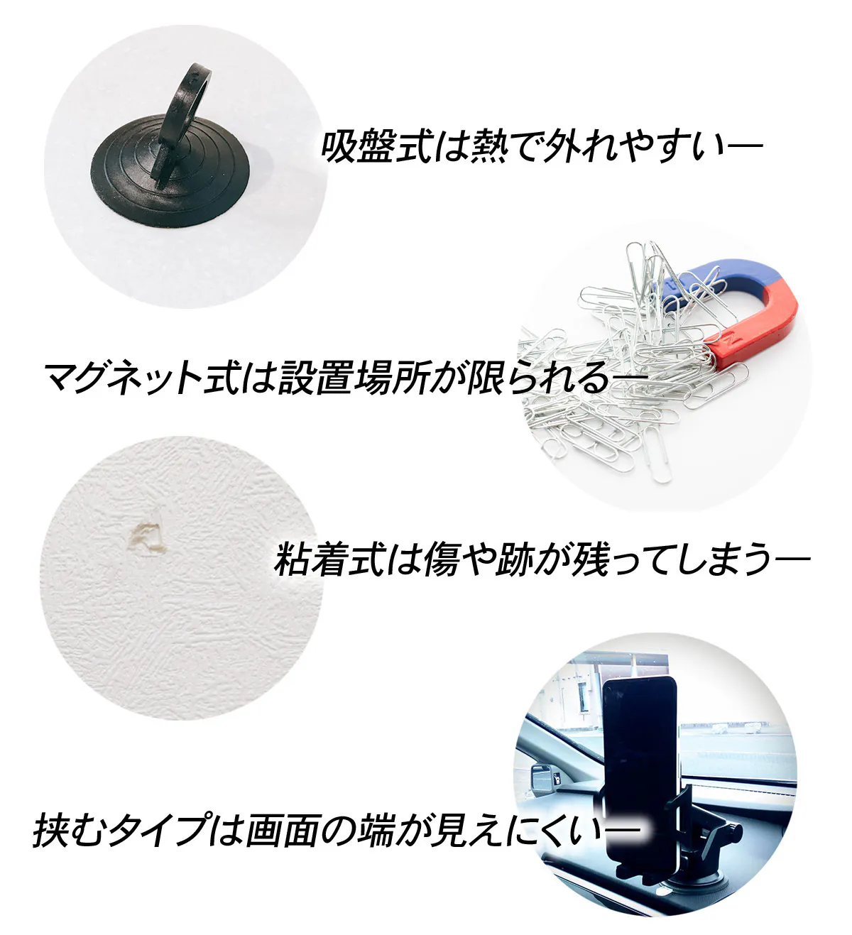 吸盤式は落ちることが多く、粘着シート式は暑さで粘着部分が溶けて跡が残る…。