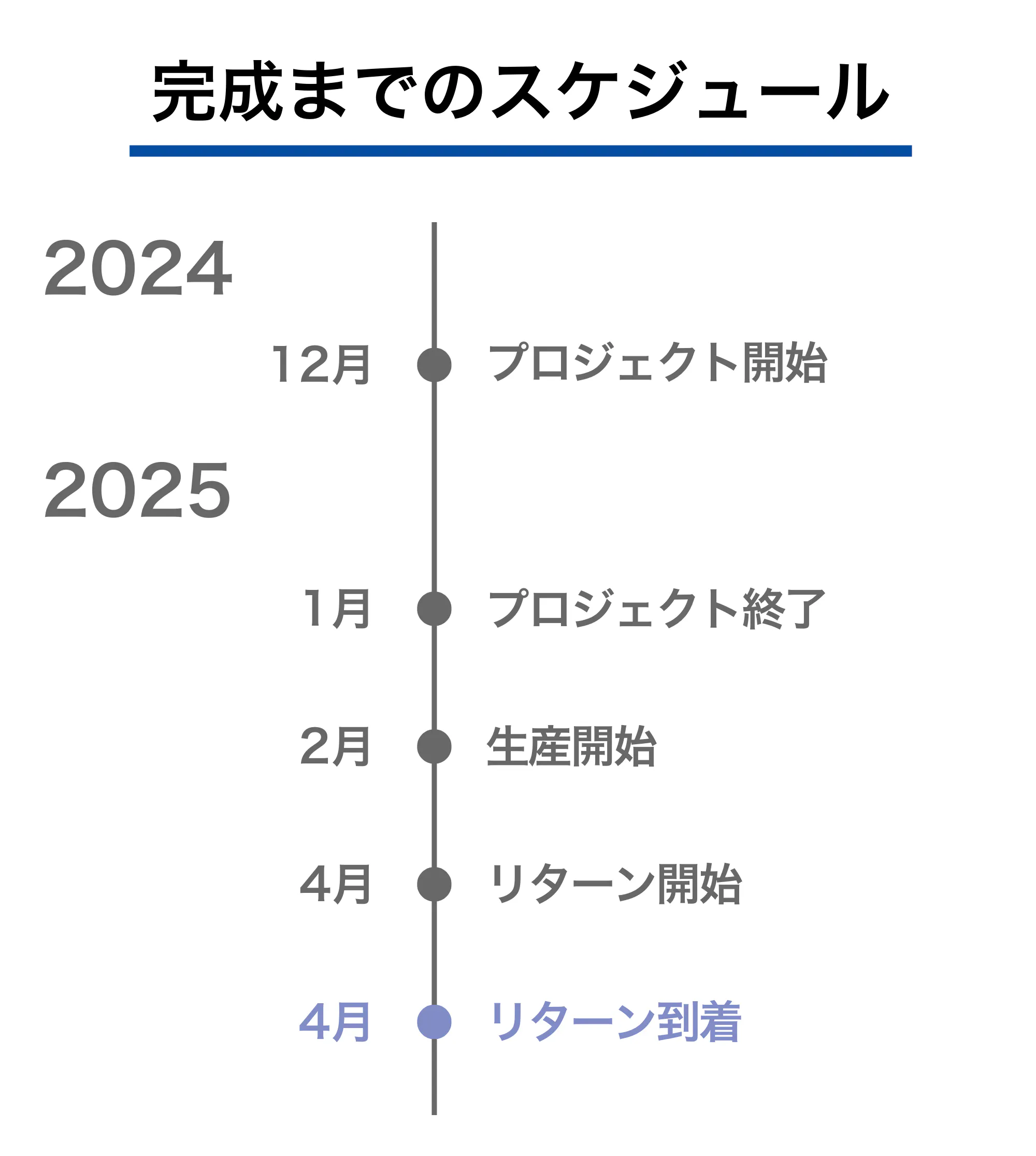 ※本文中に記載させていただいたスケジュールは、あくまでプロジェクト公開時点の予定です。クラウドファンディングの性質上、配送遅延のおそれがございます。