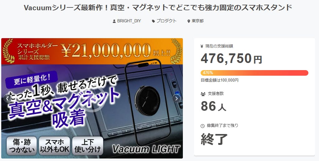 ご支援者様、Vacuumシリーズ最新作!真空・マグネットでどこでも強力固定のスマホスタンドにご興味をお持ちいただきありがとうございます。プロジェクト開始から25日目で86人ものご支援者の方々より支援頂き、無事プロジェクト終了を迎えることが出来ました。早速皆様のリターンを2025年04月末にお届けできるよう準備を始めております!皆様にご満足いただけるリターンをお届けできるよう、全力で取り組んで参りますので引き続き、「Vacuumシリーズ最新作!真空・マグネットでどこでも強力固定のスマホスタンド」をよろしくお願い致します。BRIGHTチーム