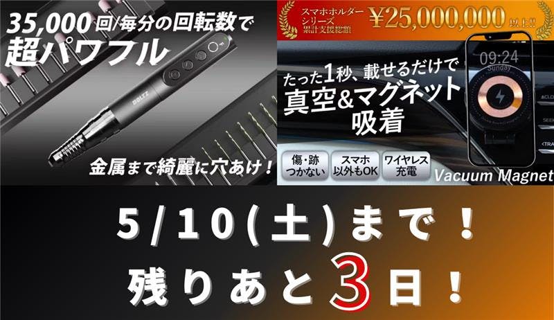 みなさん、こんばんは!BRIGHTチームです。まもなく終了のプロジェクトのご案内です。 ▼ 累計出荷数5千個◎BOLTZコードレスミニルーターで木材から金属まで加工も自由!【BOLTZ DIY TOOL+Benchtop】▼https://camp-fire.jp/projects/814601/view▼ 固定したままワイヤレス充電OK!真空&磁気吸着式折りたたみスマホホルダー【Vacuum Magnet】▼https://camp-fire.jp/projects/820851/viewMachi-ya&CAMPFIRE価格での販売のチャンスは今だけ!プロジェクト終了後のお問い合わせが増えていますので、ご興味のある方はぜひ期間中のお買い逃しがないようにお願い致します♪BRIGHTチーム