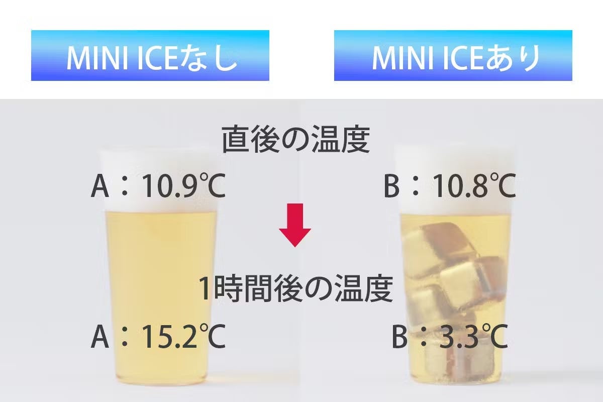 この結果から、MINI ICEが温度を保持するだけでなく、なんと飲み物をさらに冷やす効果もあることがわかりました。通常の氷では実現できない驚きの効果です。