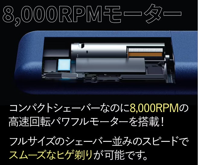 ZERA S SHAVERの最大の魅力は、そのコンパクトなサイズにもかかわらず、8,000RPMの高速回転パワフルモーターを搭載している点です。一般的なフルサイズのシェーバーに匹敵するこのスピードは、スムーズで効率的なヒゲ剃りを実現します。忙しい朝でも、短時間で完璧なシェービングが可能です。