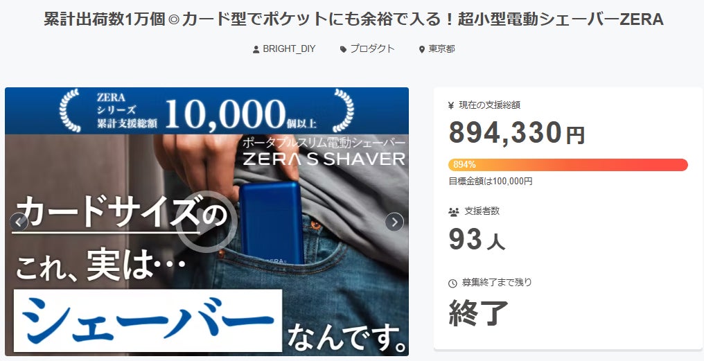 ご支援者様、累計出荷数1万個◎カード型でポケットにも余裕で入る!超小型電動シェーバーZERAにご興味をお持ちいただきありがとうございます。プロジェクト開始から40日目で93人ものご支援者の方々より支援頂き、無事プロジェクト終了を迎えることが出来ました。早速皆様のリターンを2025年04月末にお届けできるよう準備を始めております!皆様にご満足いただけるリターンをお届けできるよう、全力で取り組んで参りますので引き続き、「累計出荷数1万個◎カード型でポケットにも余裕で入る!超小型電動シェーバーZERA」をよろしくお願い致します。BRIGHTチーム
