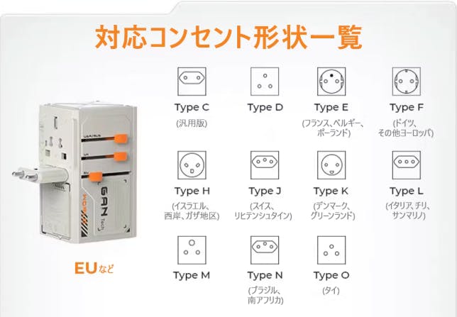 ヨーロッパ各国で広く使用されているCタイプ(2ピン丸型)、Eタイプ(2ピン丸型+接地ピン)、Fタイプ(2ピン丸型+接地ピン)にも対応しています。ヨーロッパ旅行や出張時にも、VisaPro 170Wがあれば、充電に困ることはありません。