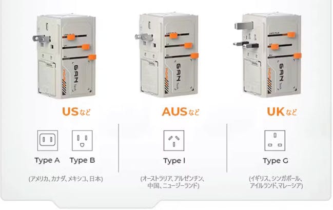 イギリスで一般的なGタイプのプラグ(3ピン、長方形のピン)にも対応可能です。イギリスに行く際も、VisaPro 170Wで簡単に充電できます。