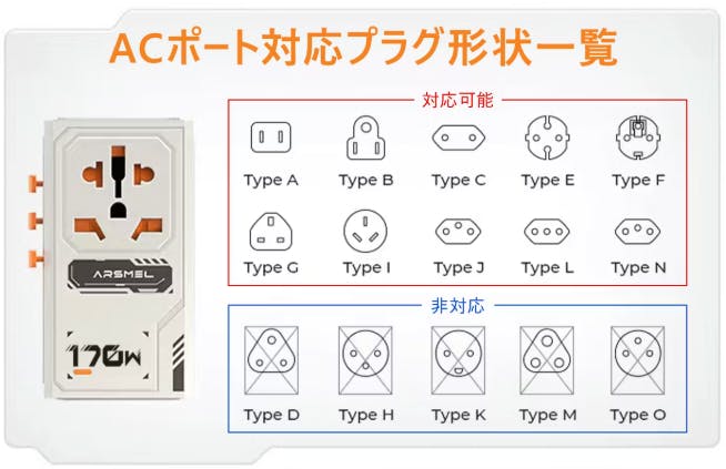 日本で一般的に使用されているAタイプのプラグ(2ピン、平型)は、VisaPro 170WのACポートで問題なく使用可能です。日本国内で普段使用しているドライヤーや電気ケトルなども、このポートで快適に充電できます。