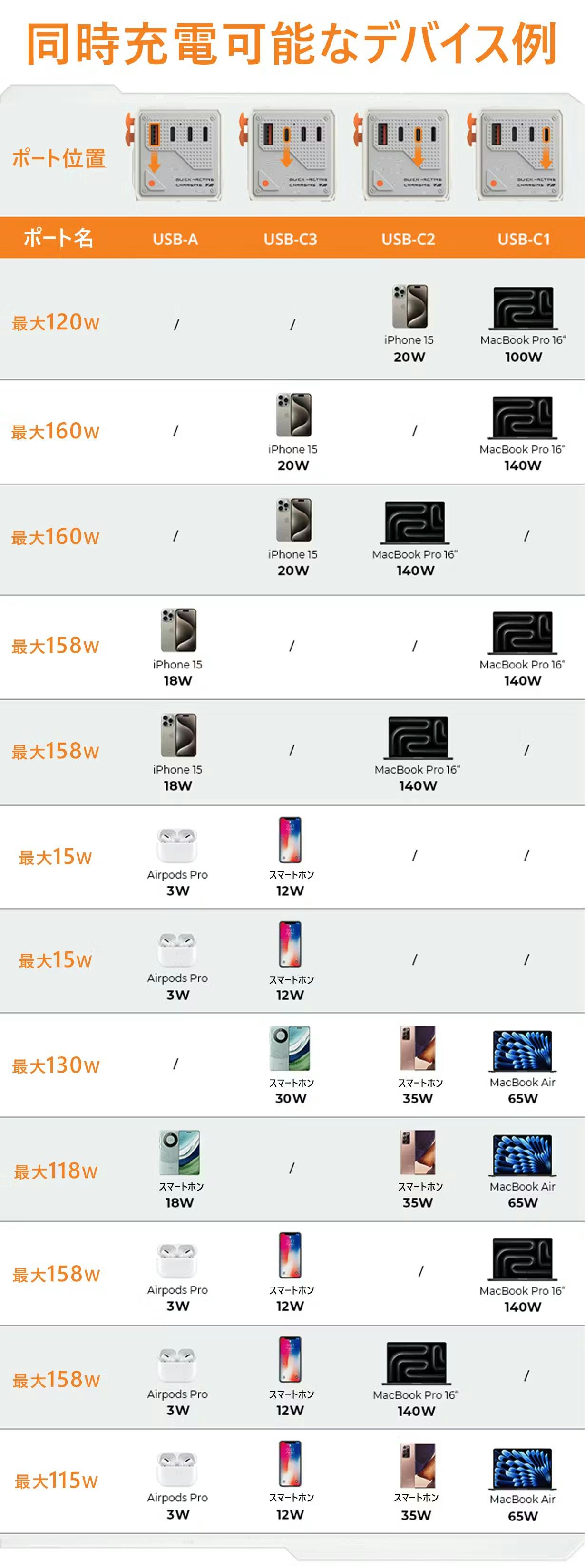 USB Type-Cポートは、特にノートパソコンやタブレットなどのデバイスを充電する際に便利で、高出力対応のこれらのポートを使えば、大きなデバイスでも充電がスムーズです。さらに、最大140Wの出力により、大容量バッテリーを持つデバイスにも十分な電力を供給することができるため、外出先でもPCやタブレットのバッテリーを素早く補充できます。
