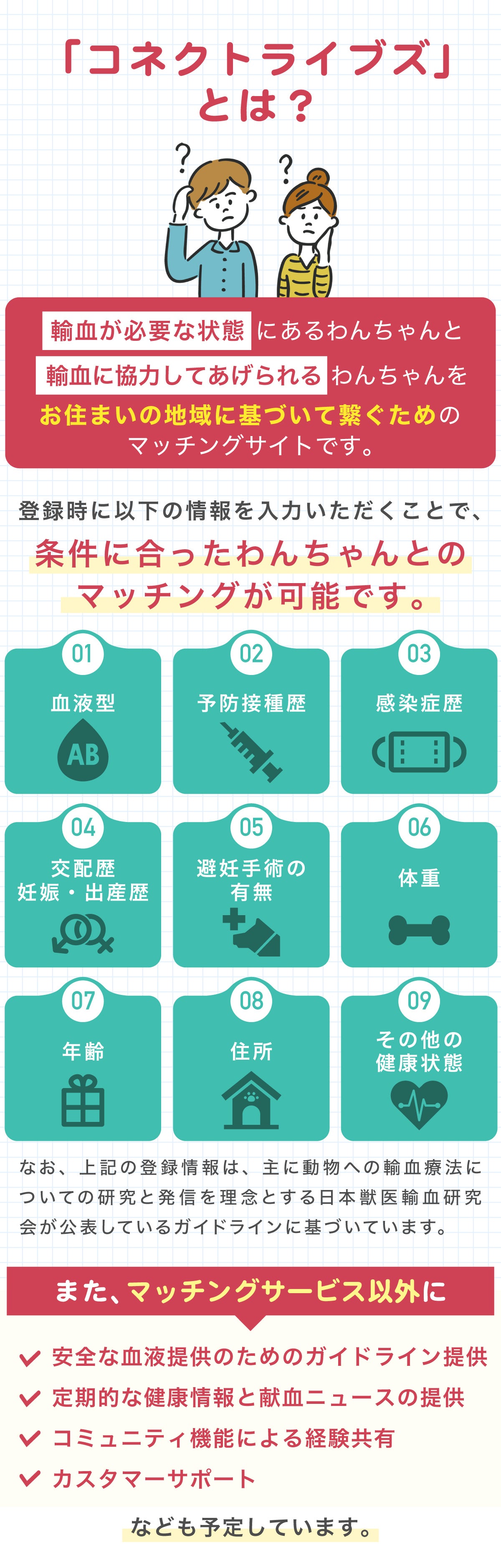 「貧血」「低タンパク状態」「止血機能の異常」といった輸血が必要な症状は、いつ現れるかわかりませんが、あらかじめコネクトライブズに登録しておくことで、万が一の時の備えになります。