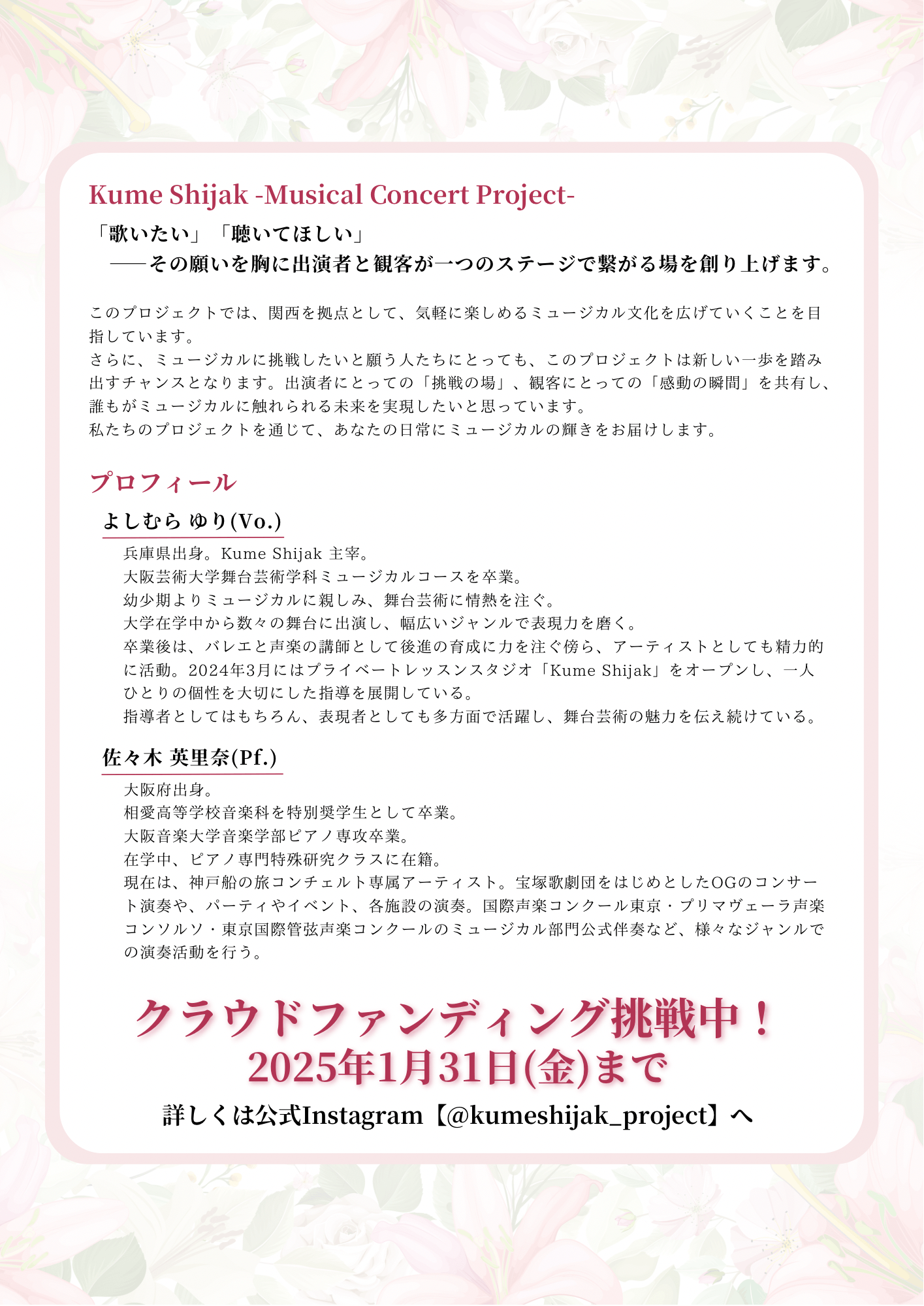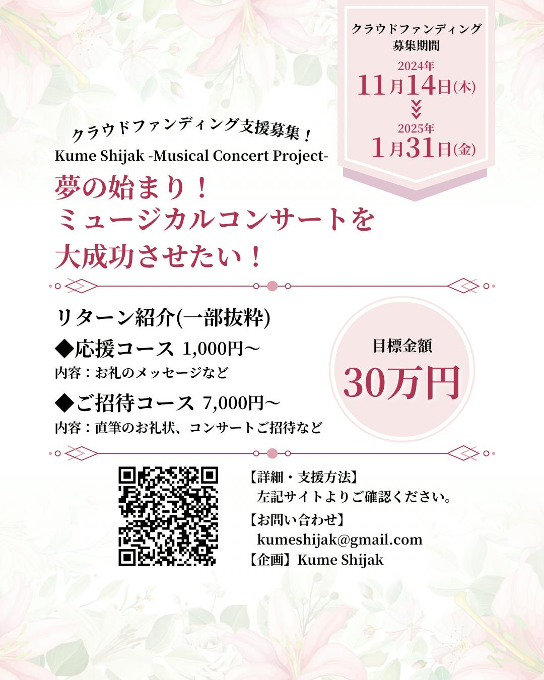 2024/11/16 13:22皆さま、こんにちは。Kume Shijak ‐ミュージカルコンサートプロジェクト-主宰のよしむらゆりです。11月14日(木)よりクラウドファンディングが始まりました。早くも2日が経ち、連日多くの方に閲覧していただいております!このプロジェクトに興味を持ってご覧くださっている皆さま、本当にありがとうございます。◆誰もがミュージカルに挑戦できる場を創りたい◆ミュージカルを当たり前に触れられる場を創りたいその想いを実現するために尽力してまいります!皆さまのご支援がこのプロジェクトを実現する大きな力となります!ぜひ一緒にミュージカルの魅力を広げていきましょう! もっと見る