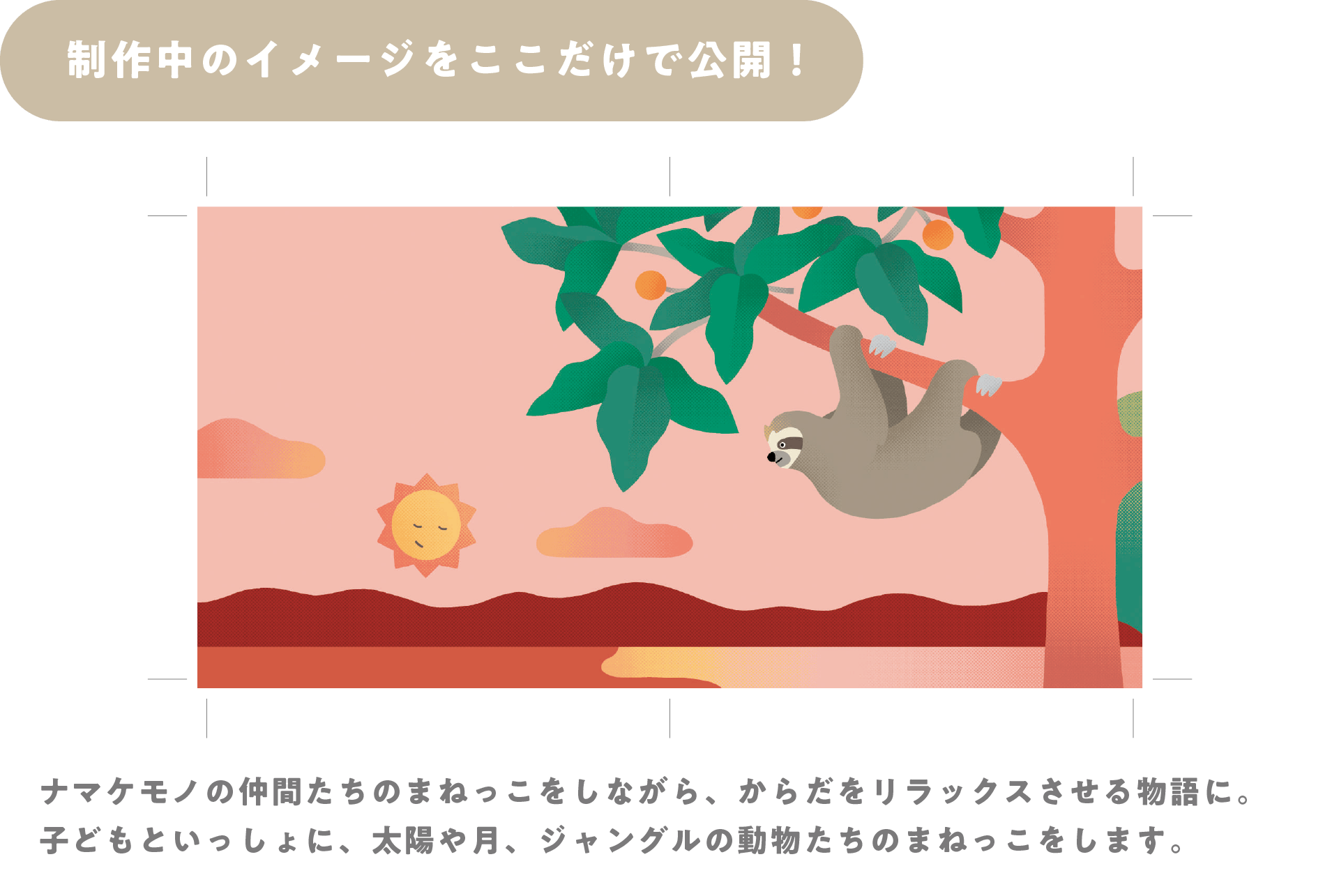 『ナマケモノのまねっこたいそう』の物語は、主人公であるナマケモノが絵本内に登場するかわいいキャラクターをまねっこしているうちに眠ってしまうお話です。子どもと一緒にカラダを動かして、気持ちもリラックスできるようにヨガの動きを取り入れています。子どもとのコミュニケーションの一つである絵本の読み聞かせを通して、ママパパも一緒におやすみできるきっかけを作れたら…という想いから物語を作っていきました。