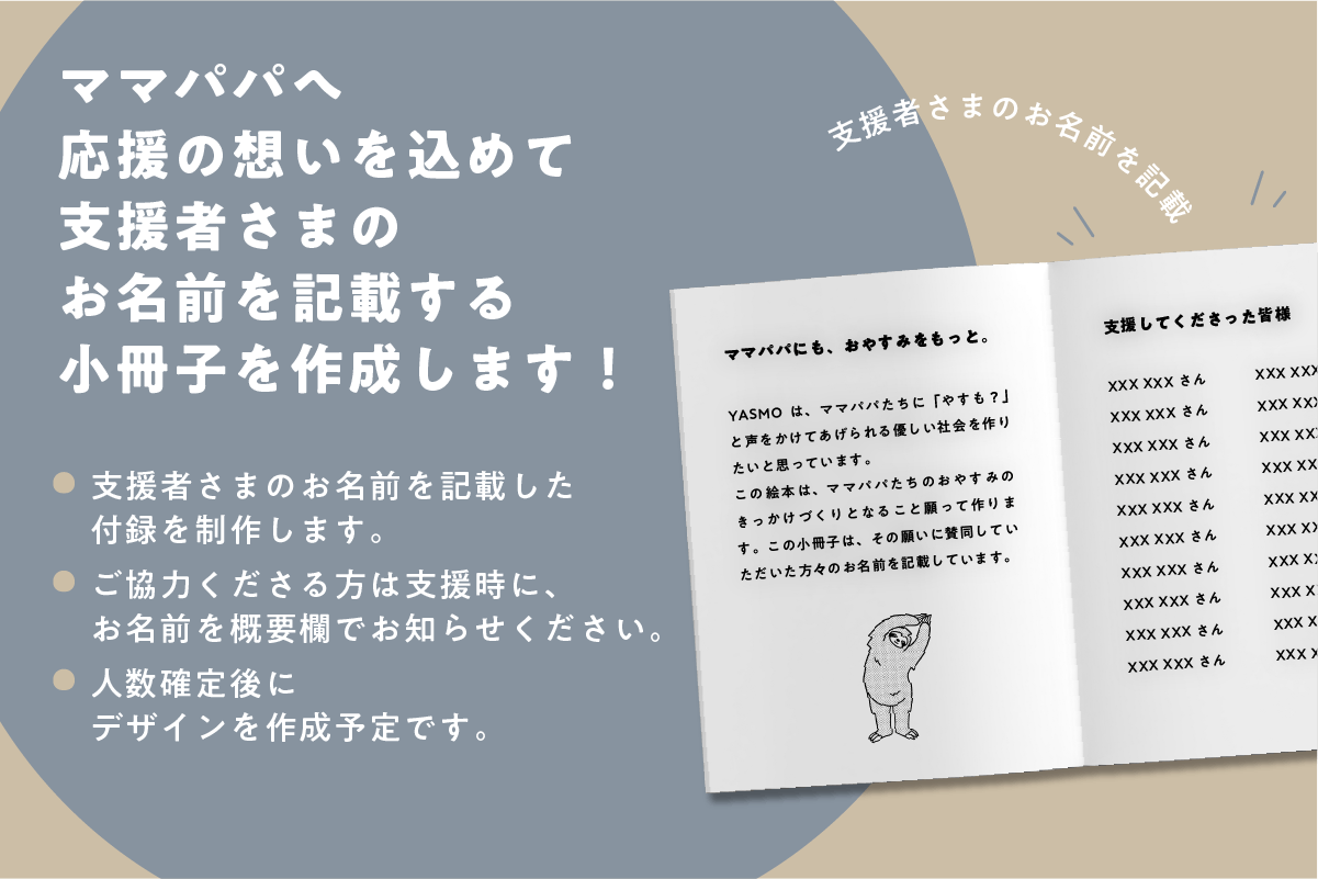 皆さまからのご支援を通してこの絵本が広まることで、一人でも多くのママパパにおやすみを届けたい。