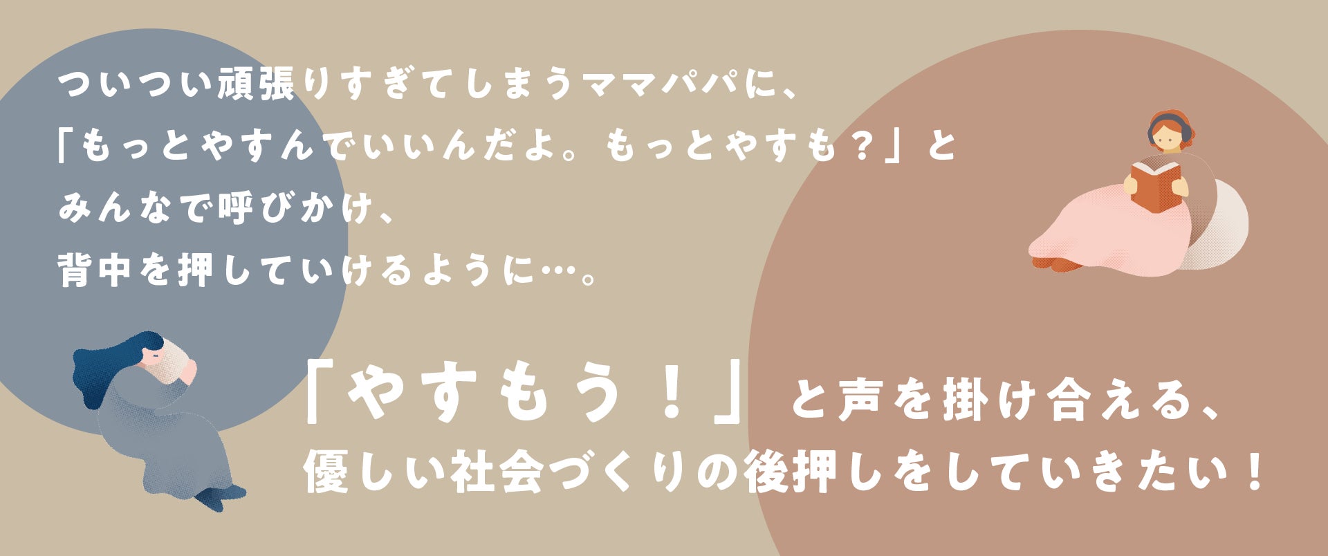 ついつい頑張りすぎてしまうママパパに、「もっとやすんでいいんだよ。もっとやすも?」とみんなで呼びかけ、背中を押していけるように。