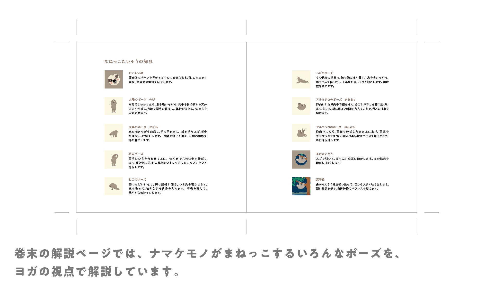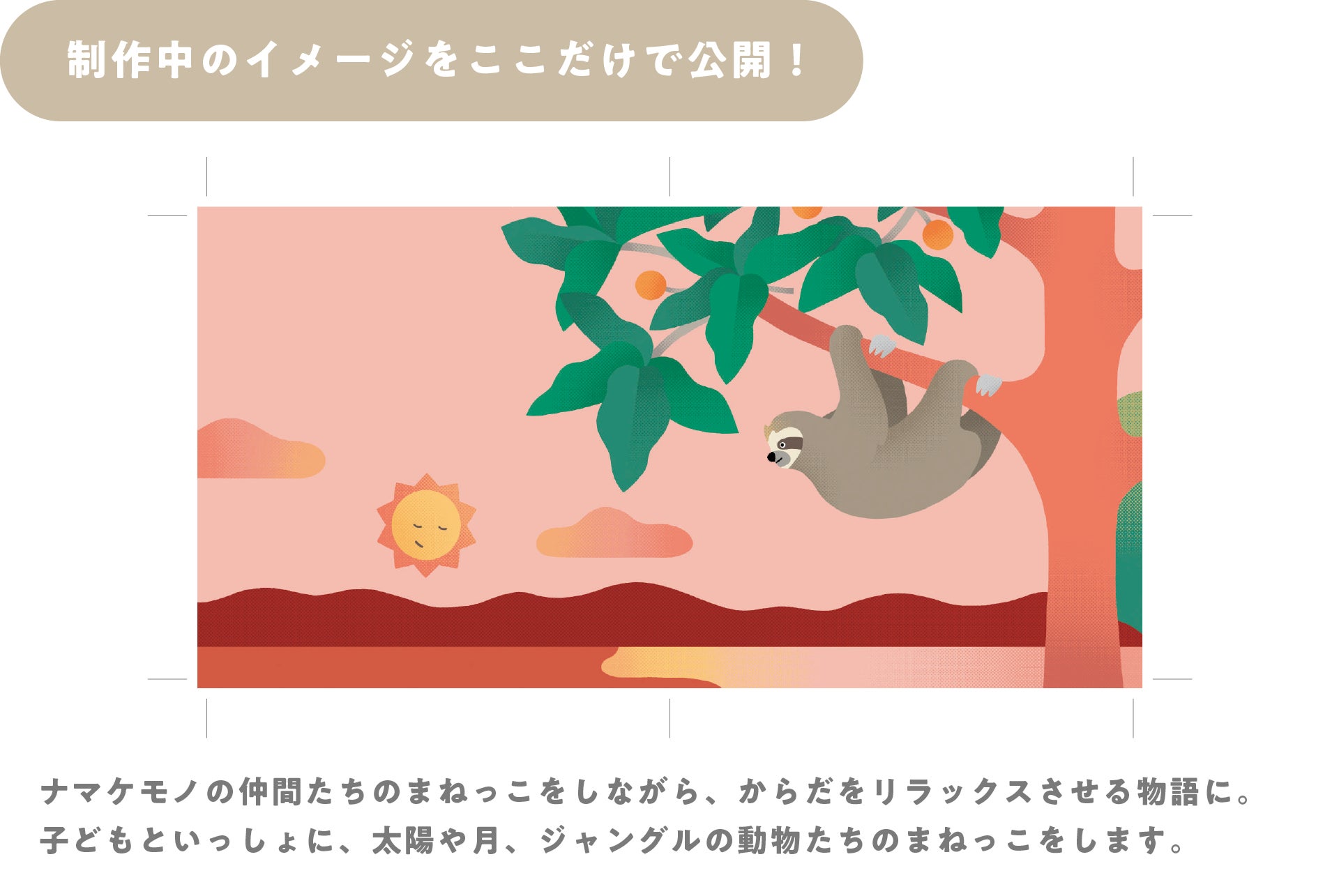 『ナマケモノのまねっこたいそう』の物語は、主人公であるナマケモノが絵本内に登場するかわいいキャラクターをまねっこしているうちに眠ってしまうお話です。子どもと一緒にカラダを動かして、気持ちもリラックスできるようにヨガの動きを取り入れています。子どもとのコミュニケーションの一つである絵本の読み聞かせを通して、ママパパも一緒におやすみできるきっかけを作れたら…という想いから物語を作っていきました。