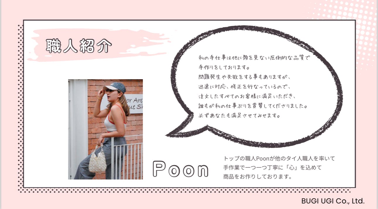 タイの温かい文化や素晴らしい職人技が私のインスピレーションの源であり、彼女たちのアートを世界に広めることが私の使命です。