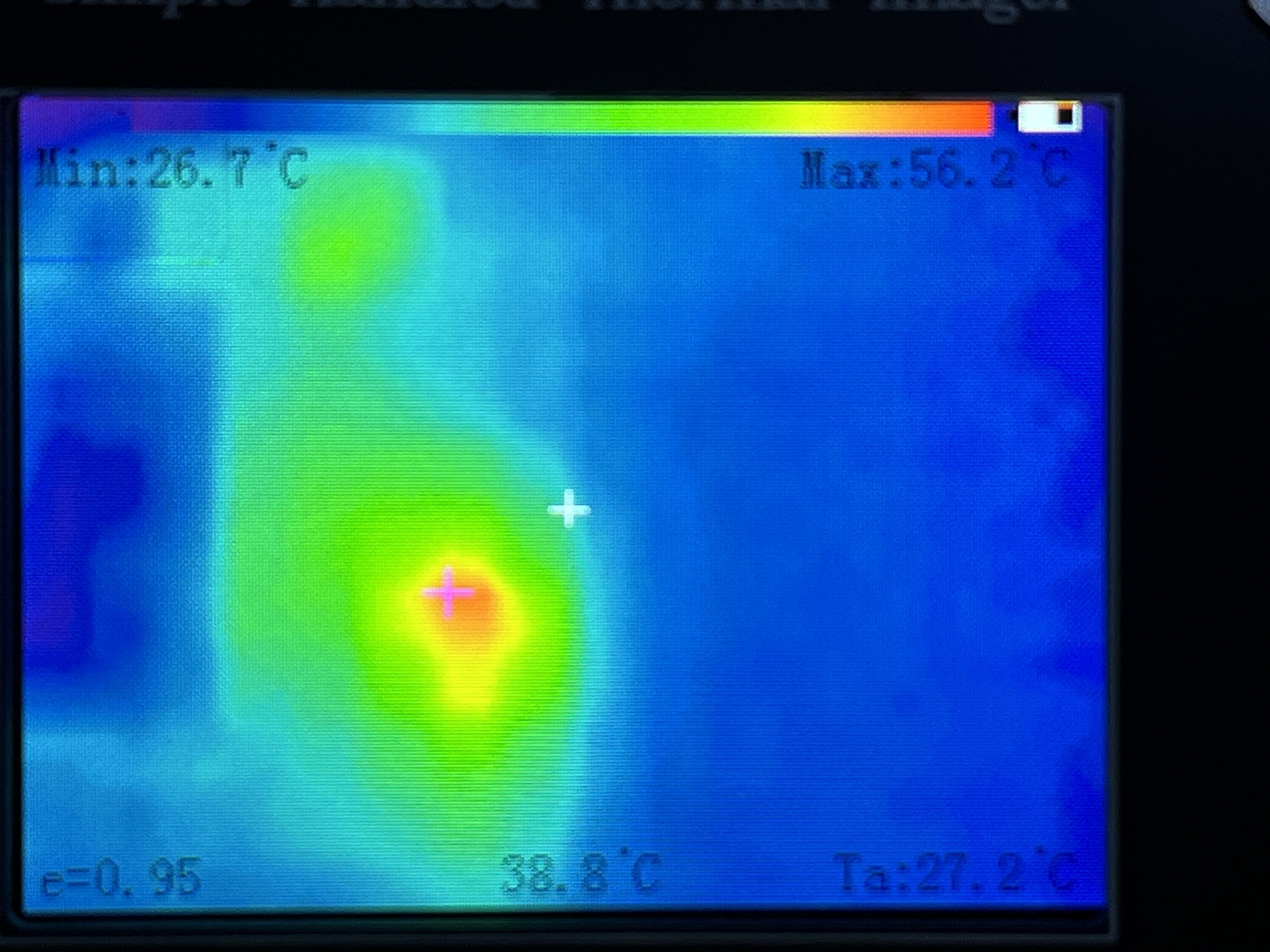 実際に100Wを電子負荷で消費させている状態です。安全の為ヒューズが搭載されているので、ヒューズ自体の発熱は確認できますが、回路基板にはまったく影響がありませんでした。