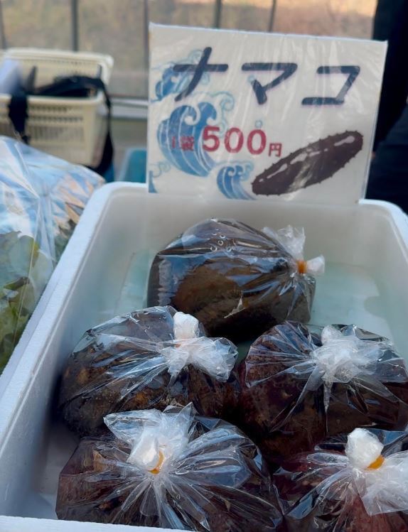 最後にこんな商品も。朝どれのなまこです!1袋に5匹入っていて500円。びっくりして思わず笑ってしまうお値段でした。(今日の晩御飯はなまこ酢と新鮮野菜のお鍋で決定です)