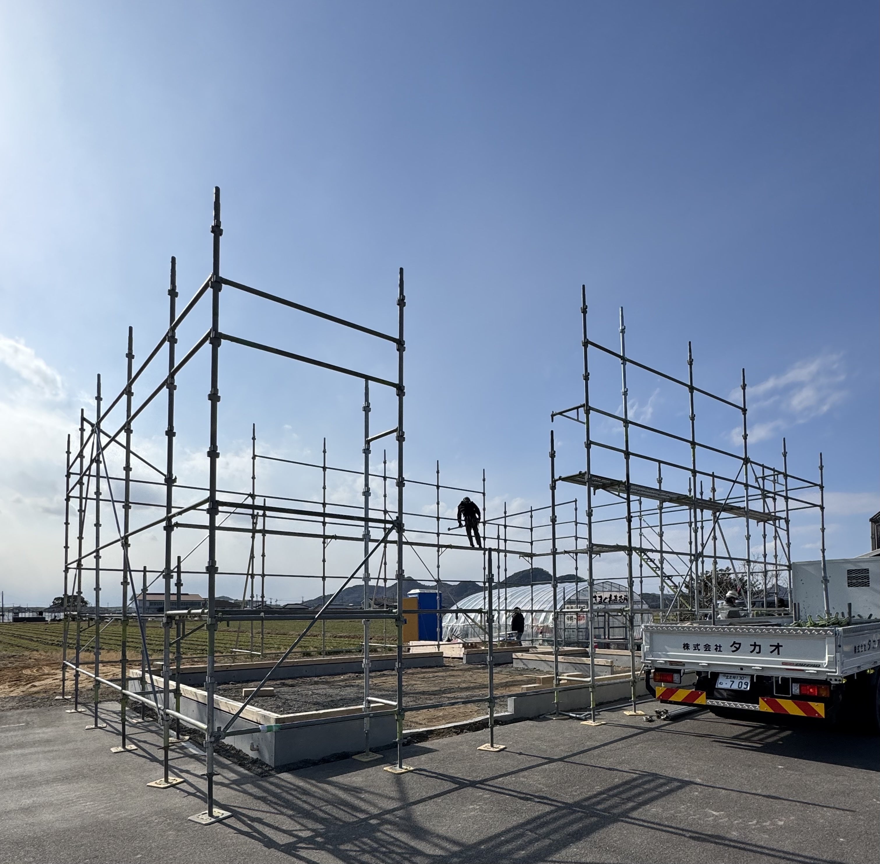 名田島食堂の店舗建設ですが着々と進んでいます。本日は足場の組立でした、あっという間に組み立てられた足場は圧巻でした。