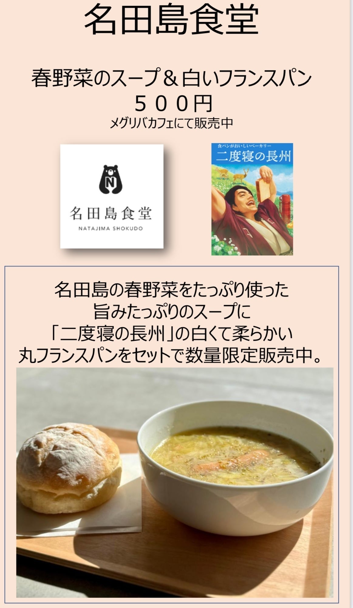 メインイベント巨大パエリアの近くに名田島食堂のコーヒー&ハーブティーの販売ブースを出店。そしてメグリバカフェにて名田島の春野菜をたっぷり使ったスープ&二度寝の長州さまの白いフランスパンをセットで提供させて頂きました。