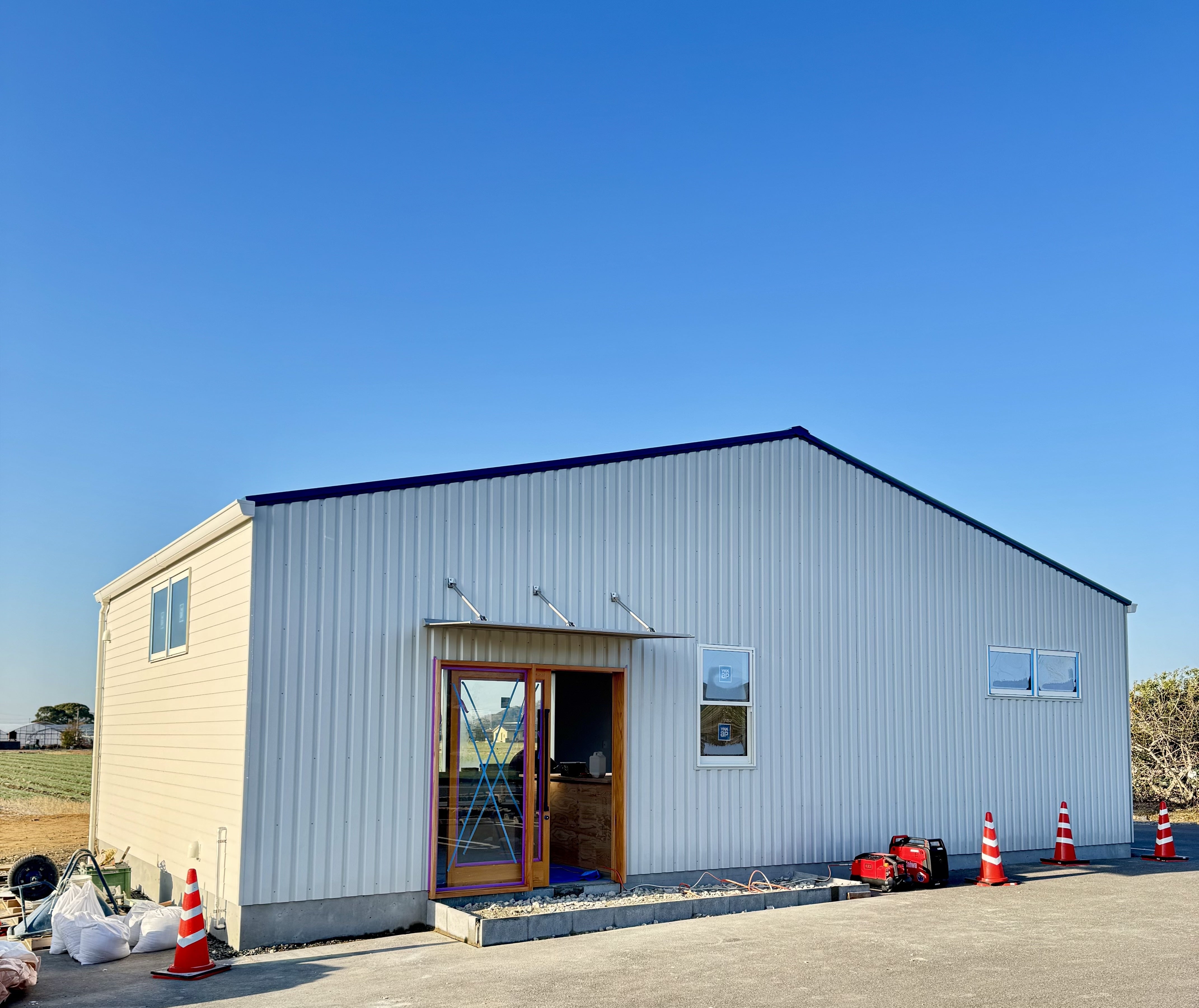 店舗建設ですが店舗外観がほぼ完成致しました!白い壁に青い屋根が目印です。今後は主に内装工事を進めていく予定となります。