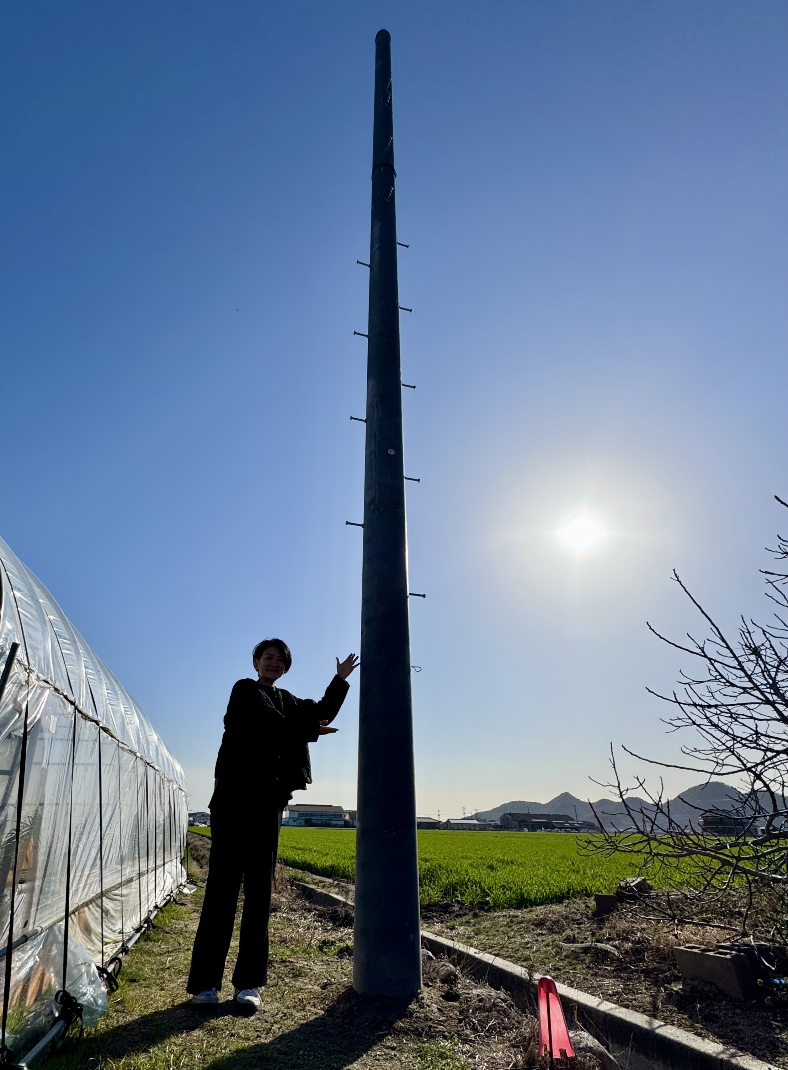 本日、名田島食堂に電柱が設置されました。田んぼの真ん中ということで、敷地内に新しい電柱を設置いただき、既存の電柱から電線を延長して工事をして頂きます。