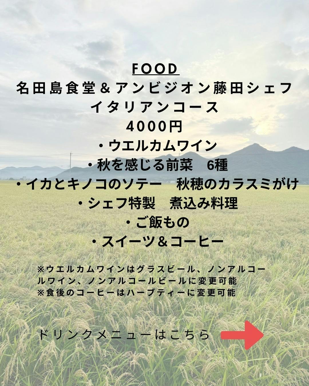 一つは、名田島食堂初めての夜イベントです!9月22日(月)に実施します。黄金色に染まった田んぼと、茜色に暮れていく名田島自慢の景色を見ながら、イタリアンとナチュラルワインを楽しめます。