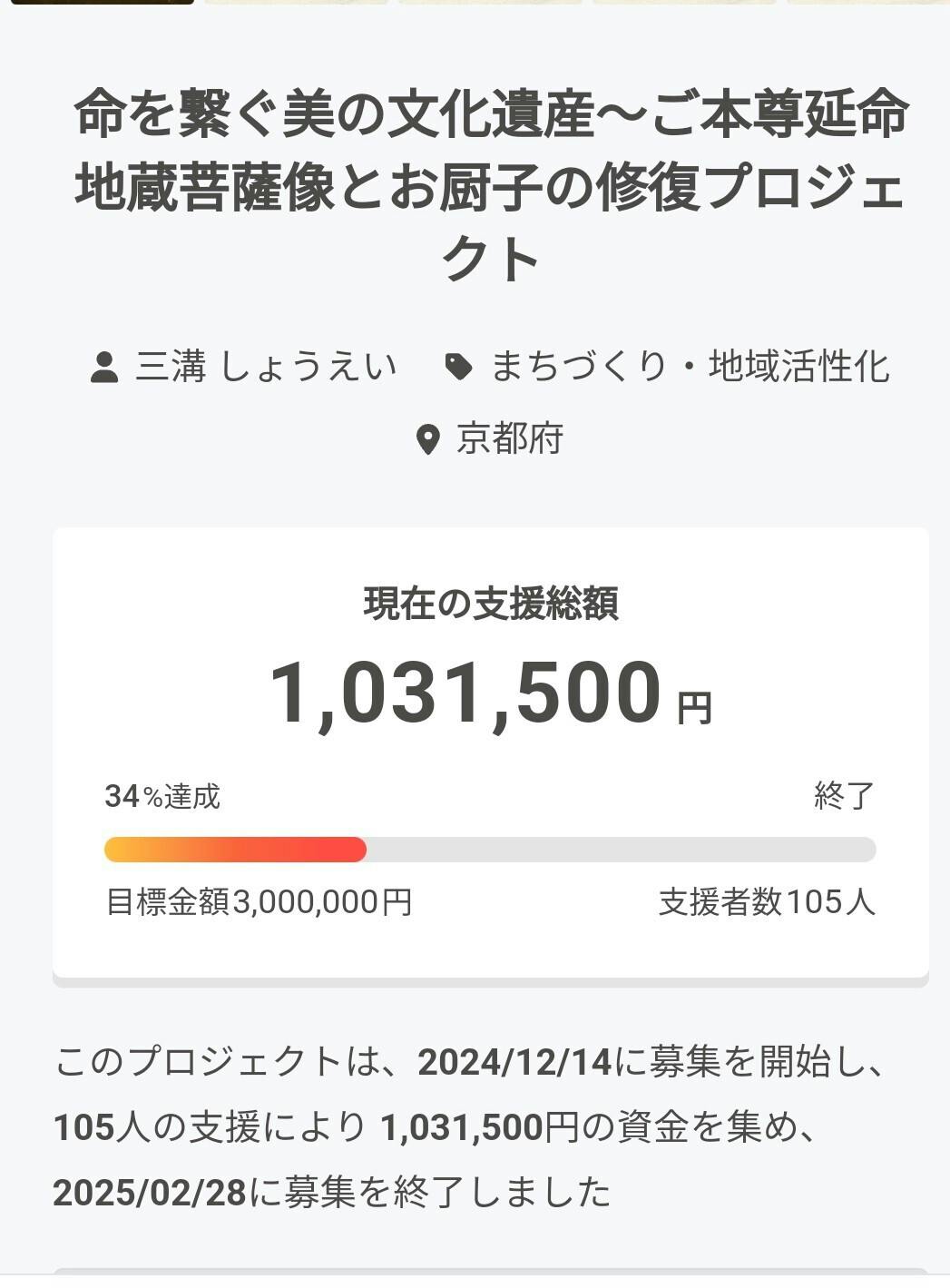 2月28日を持ちまして『命を繋ぐ美の文化遺産~ご本尊延命地蔵菩薩とお厨子の修復プロジェクト』が無事に終了致しました。