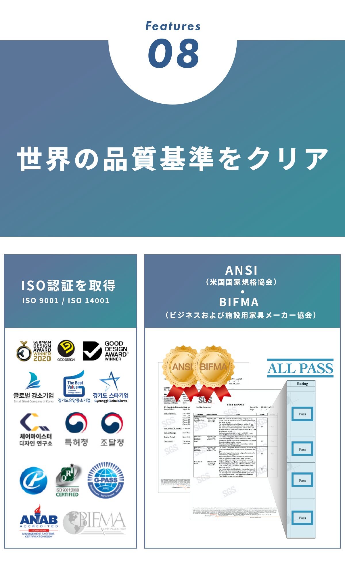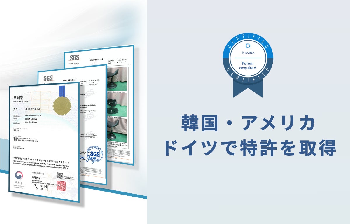 また、ISO認証も取得しています。さらに韓国のKS認証、アメリカのANSI(米国国家規格協会)、BFIMA(アメリカオフィス家具規格)なども取得。