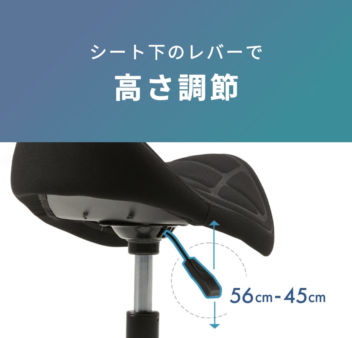 両足がかかとの床につく高さを推奨しております。45cmから56cmまで地面からシートの高さをご調整いたけます。元の高さに戻したい場合は、椅子から降りてレバーを押して引き上げてください。