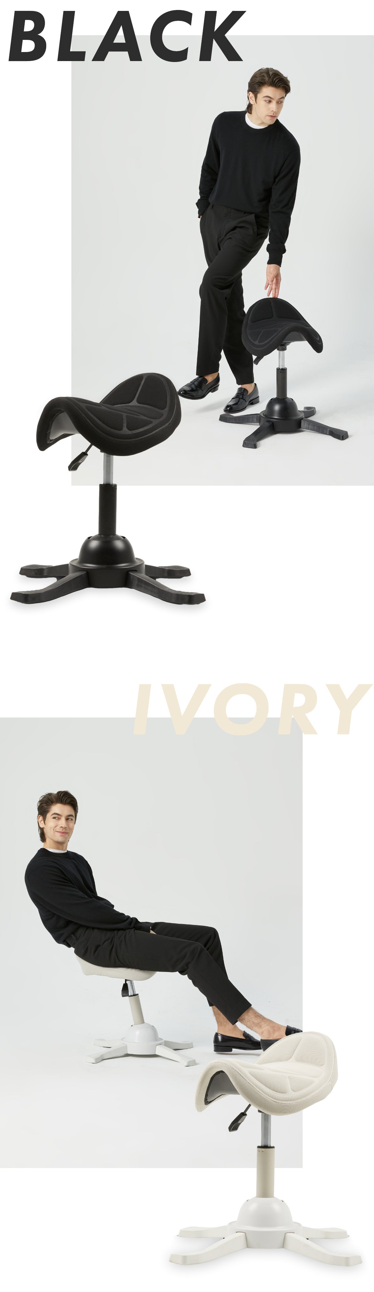 A2.良い姿勢の秘密は乗馬スタイル。乗馬スタイルをとることで、腰を自然に支え、背骨の理想的なS字カーブをキープ。身体への負担を軽減し、座るだけで無理せず良い姿勢をサポートします。
