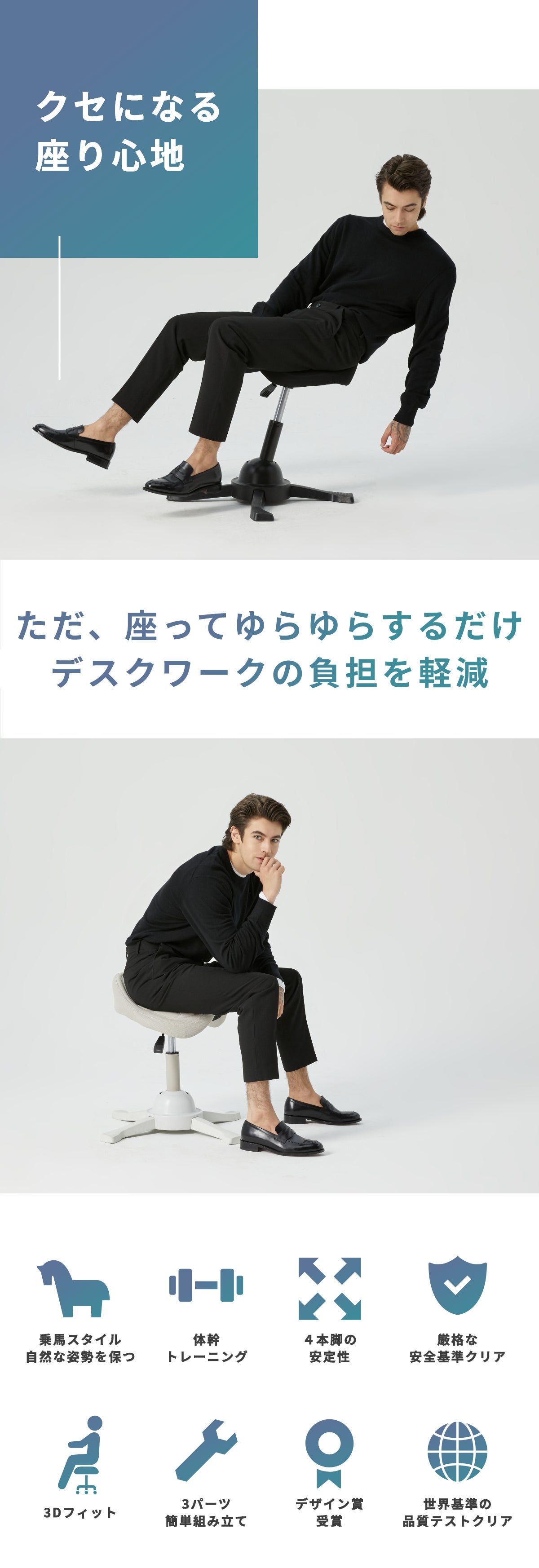 A2.良い姿勢の秘密は乗馬スタイル。乗馬スタイルをとることで、腰を自然に支え、背骨の理想的なS字カーブをキープ。身体への負担を軽減し、座るだけで無理せず良い姿勢をサポートします。