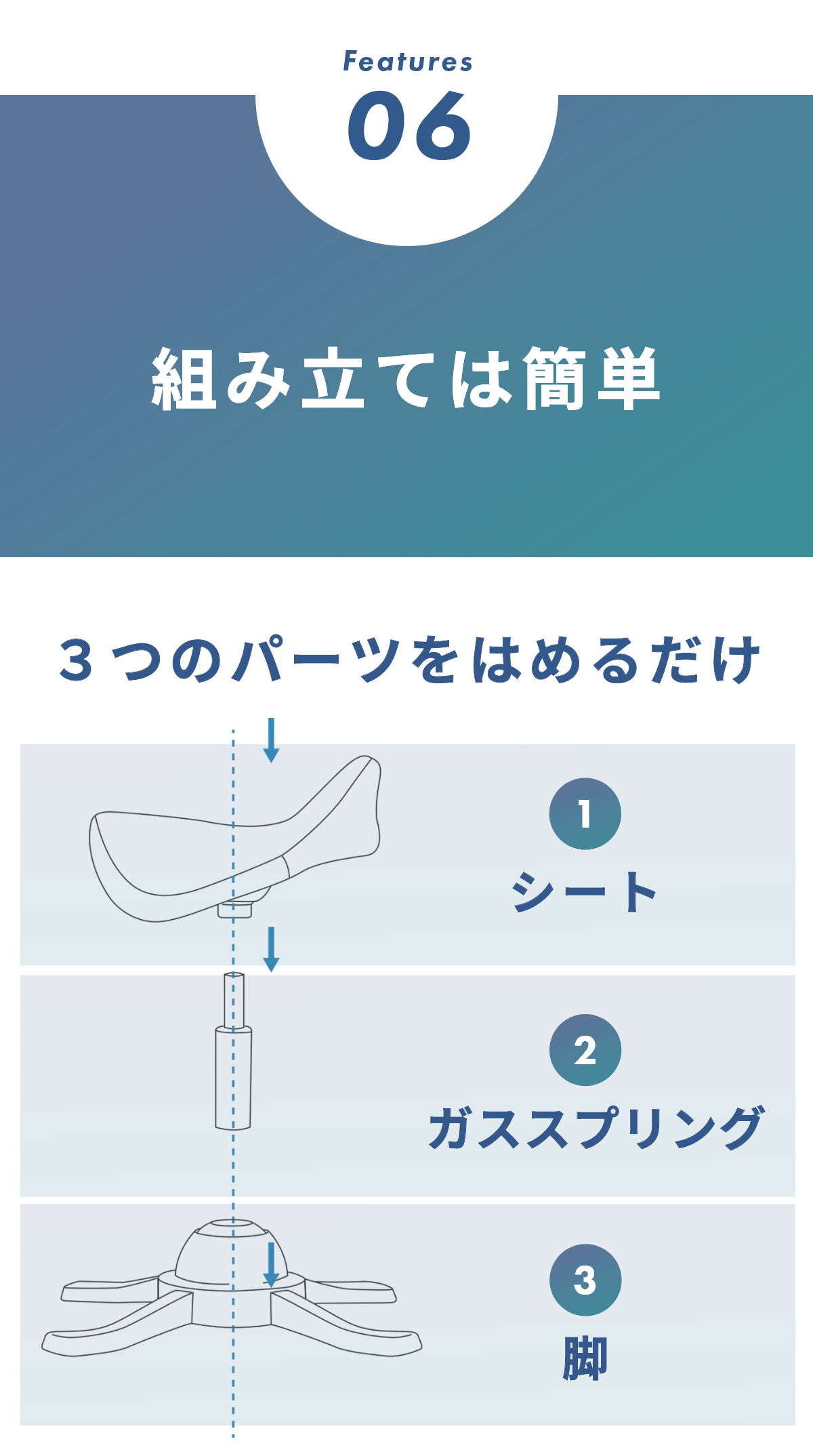 3つのパーツをはめ込むだけですぐにご使用いただけます。工具なしで組み立てられるので、難しい説明書が苦手な方でも難なく組み立てられます。