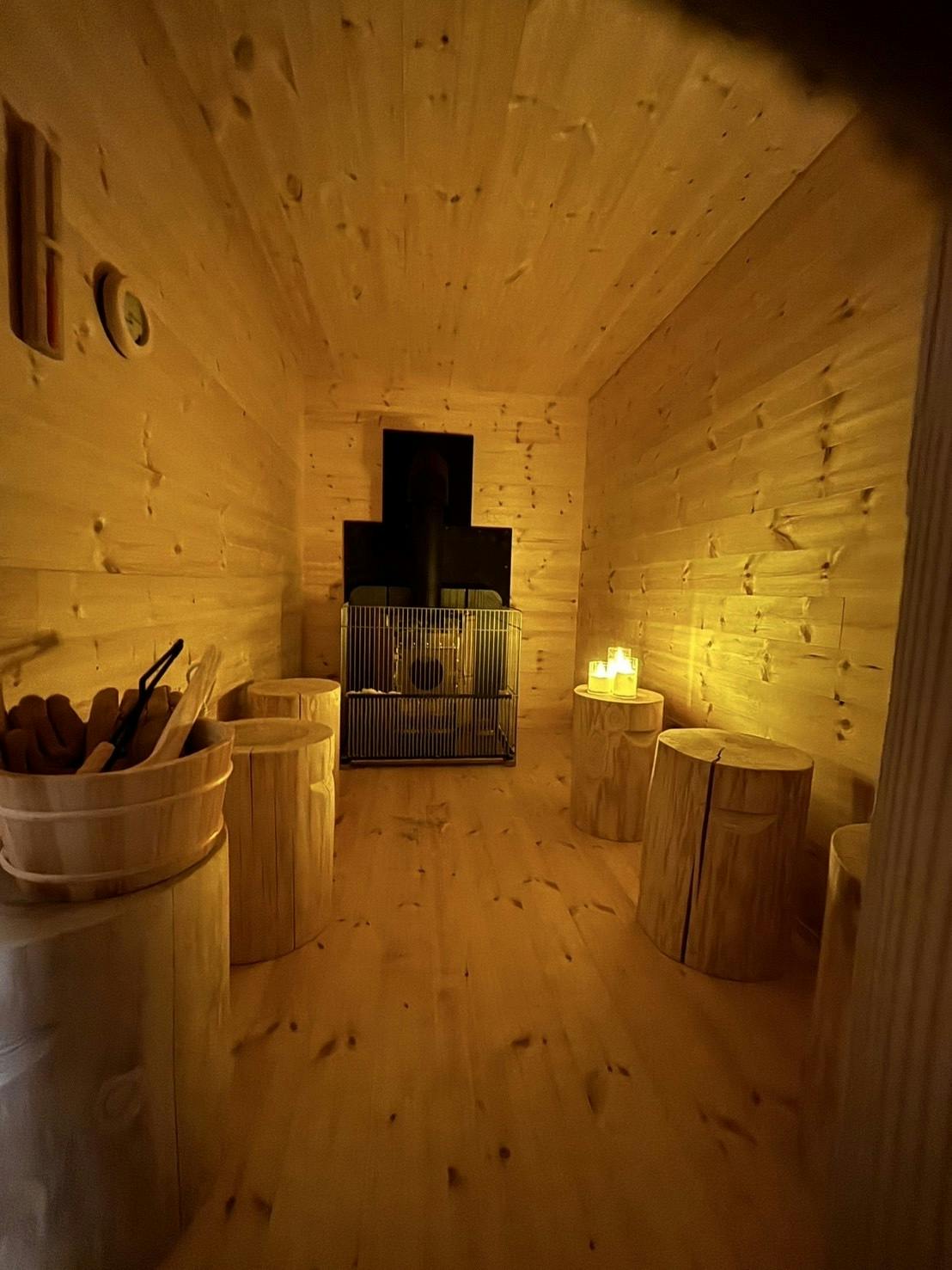 4棟のうち、サウナのある2棟。お泊りいただいた皆様には大好評です。そのうちの3号棟のサウナ、6人一緒に入っていただける大きさになっています(6人入っても余裕があります)。最近いらっしゃったお客様はお友達同士でサウナを楽しめたとのことで大変喜んでくださいました。雪山を眺めながら涼むのは最高とのことです!!