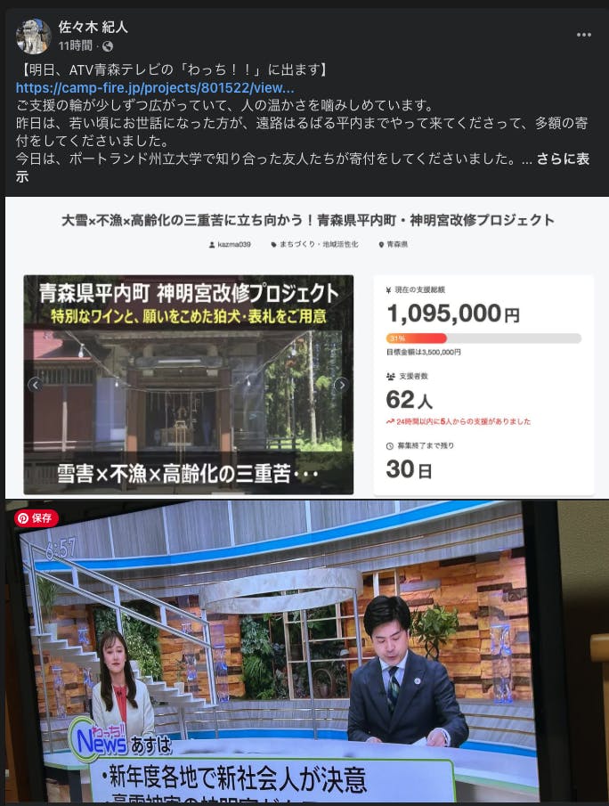 2025/04/24 11:26ご支援をくださった皆様、拡散のご協力してくださった皆様、応援をしてくださった皆様すべての方に本当に感謝の気持ちでいっぱいです。青森ローカルですが、TVで取り上げて頂いたり、https://news.yahoo.co.jp/articles/7e076df319d6744a685a8387d3af6fdba4b7b954/images/000yahooニュースで時事通信様に取り上げて頂いたり、https://news.yahoo.co.jp/articles/a4f27584eb7c5178d1251f535f8d4dd5a0b67744?page=2yahooニュースATVで取り上げて頂いたりと県内の方々が協力をしてくださって全国の方へ呼びかけのお手伝いをして頂くことができました。私たちと同じ境遇、悩み等抱えている神社の関係者の方々はたくさんいると思います。そして、こんな小さな町、青森県の過疎化が進んだ町でも全国の方々のあたたかいご協力で再生し、守ることができそうです。残り6日となりましたが、我々にできる事を最後まで続けてみようと思います。これを読んでくださった皆様、本当にありがとうございます。 もっと見る