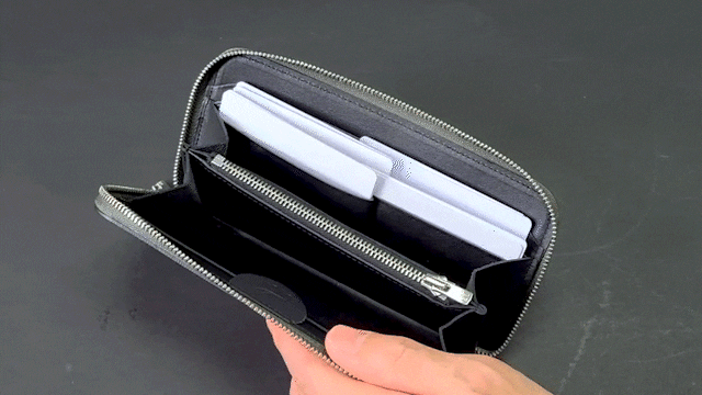 長財布の魅力はなんといっても収納力。従来のラウンドジップ長財布では無駄になっていたスペースを削ることで、コンパクトなのに大容量を実現しました。