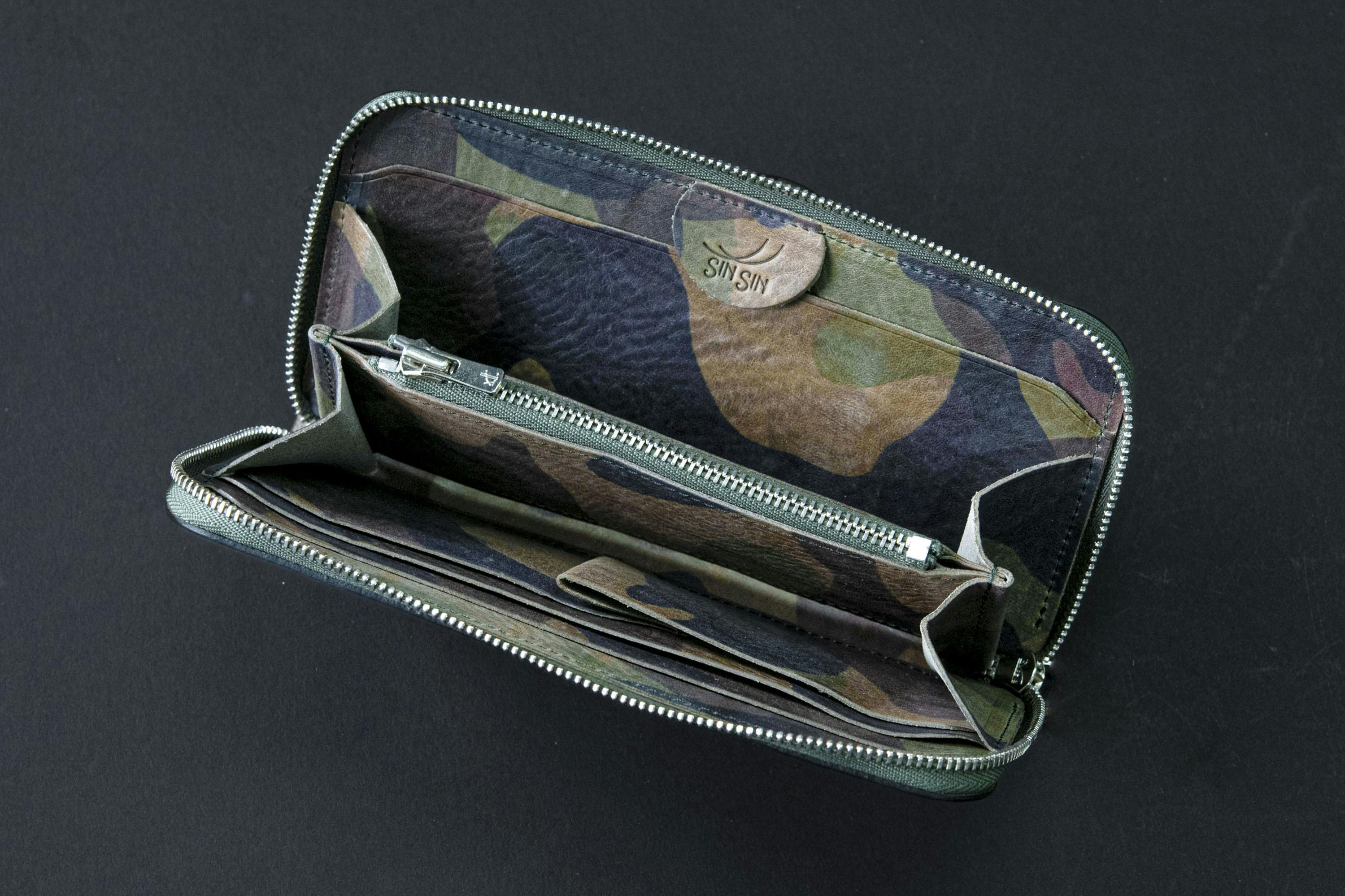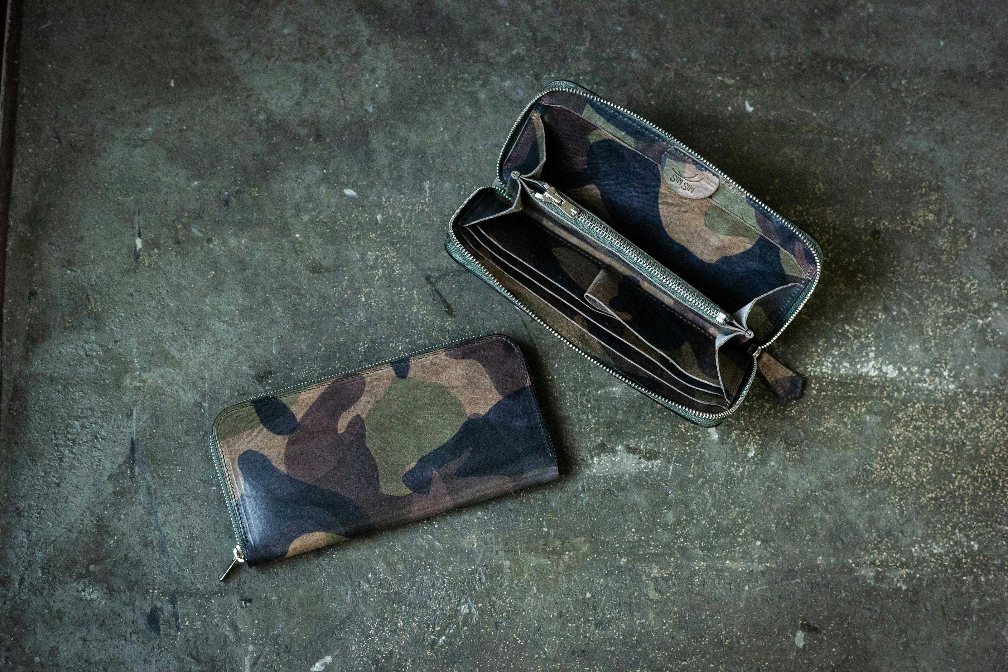 今回はイタリア・トスカーナ地方にあるフルベジタブルタンニンなめしの革のみを作るタンナー『ラ・ペルラ・アッズーラ社』のカモフラ(迷彩)柄のレザーを選びました。このカモフラ柄は一色ずつ色を重ねながら染色されている手間暇がかかるレザーです。さらにローラーをかけることでプルアップ効果と自然なツヤ感が生み出されています。本革のナチュラルさを残しつつ、ワイルドさと上品さのどちらも併せ持つレザーです。