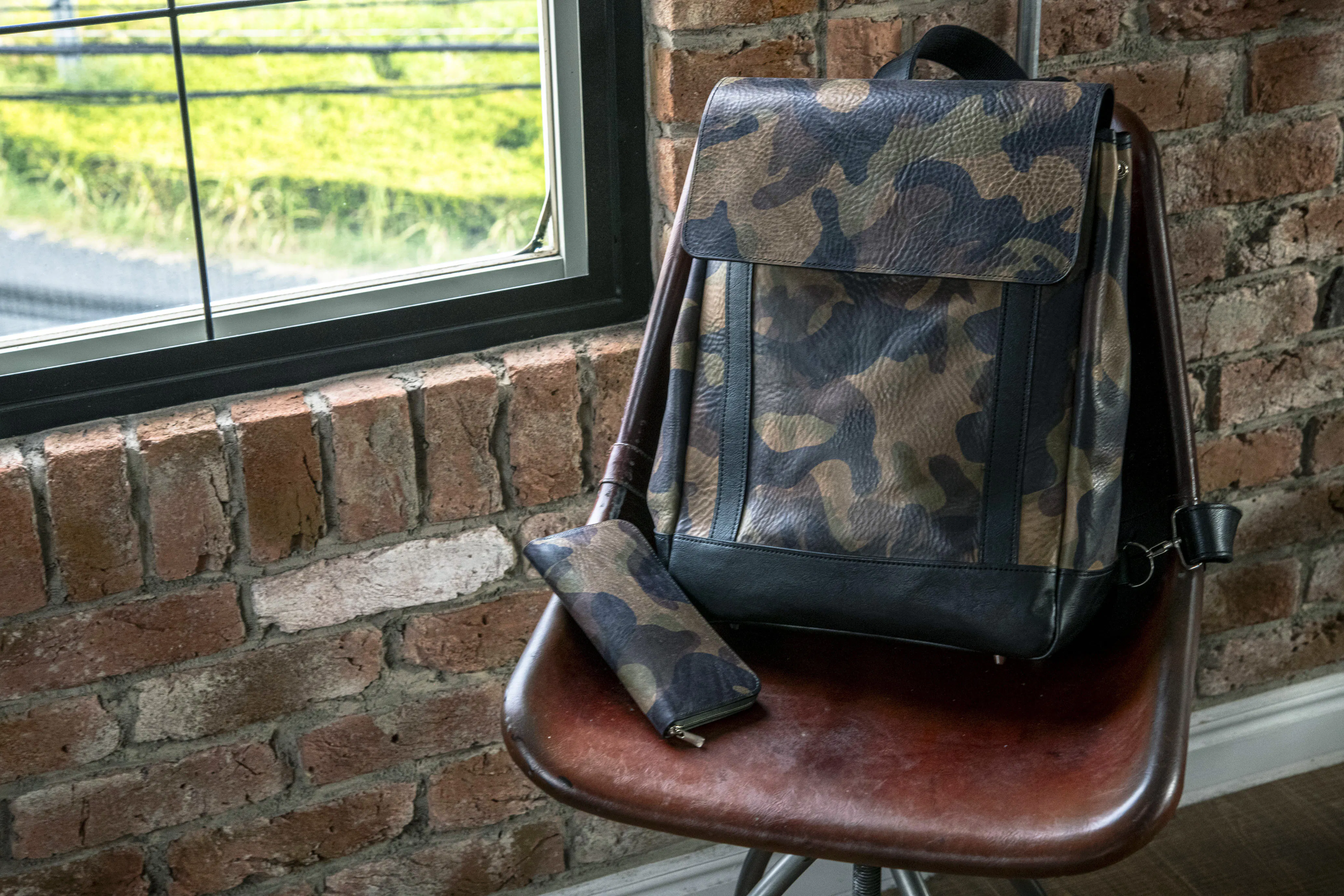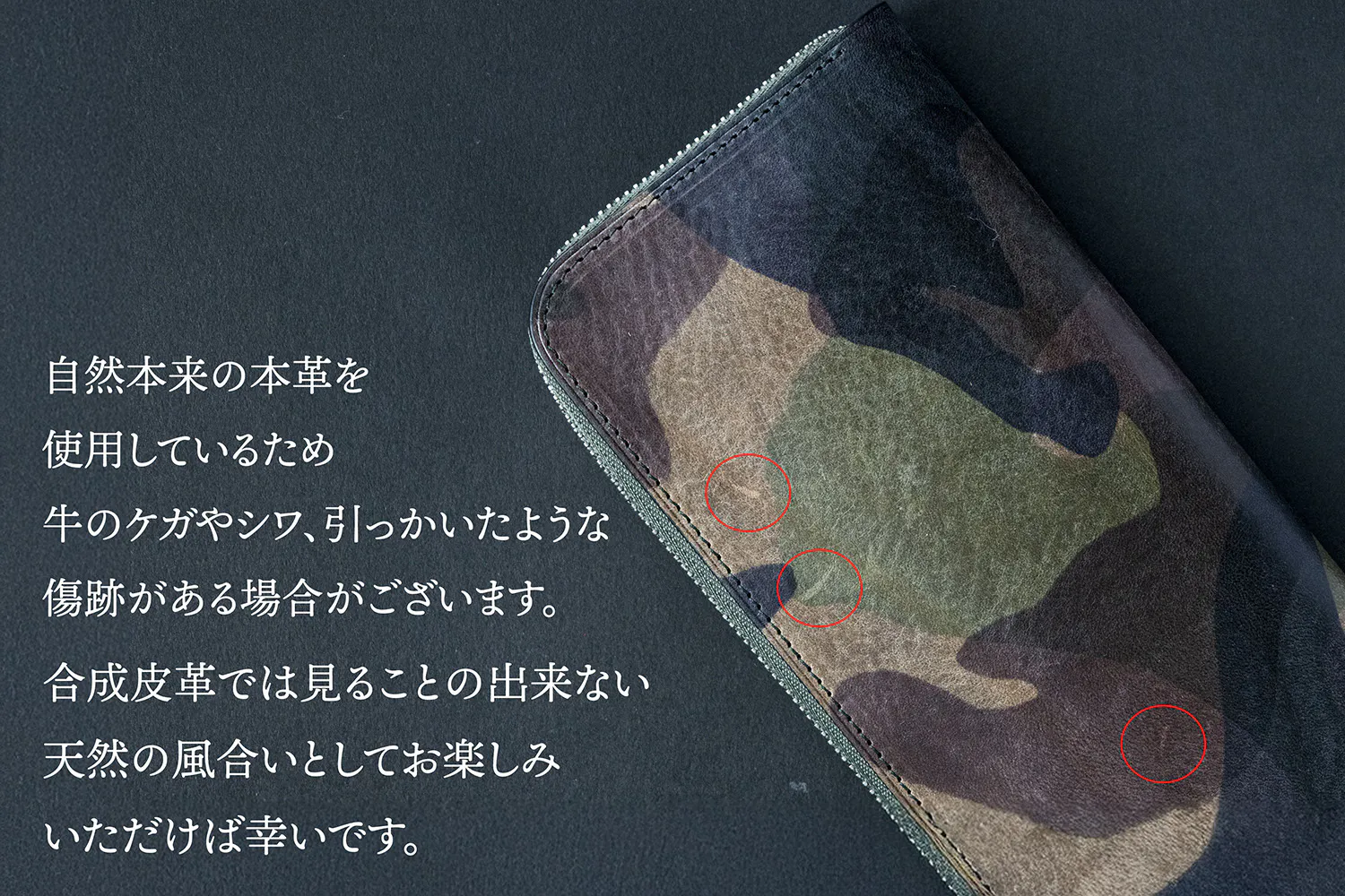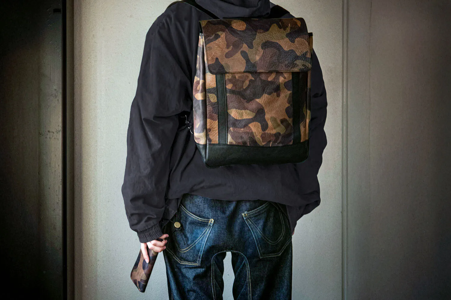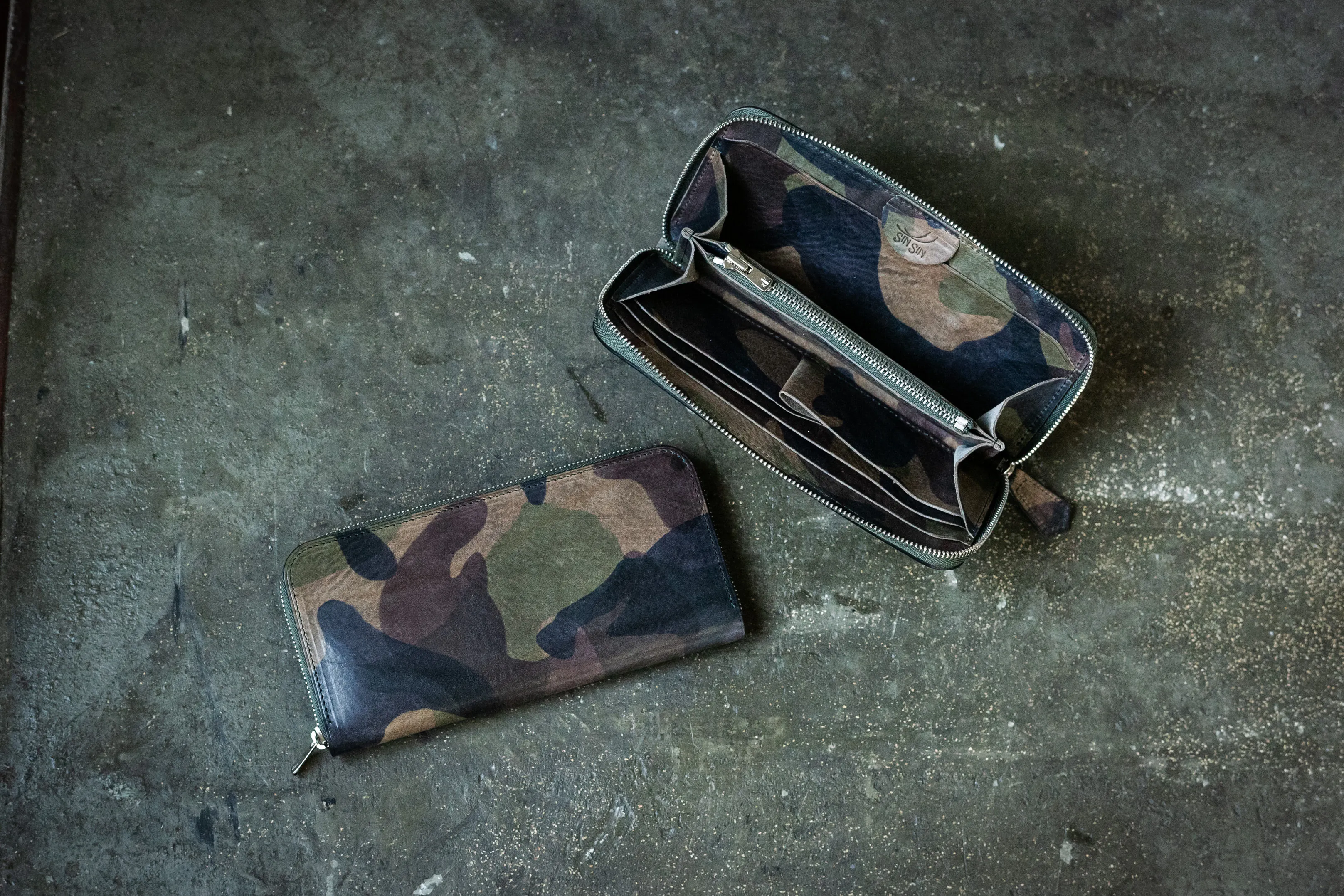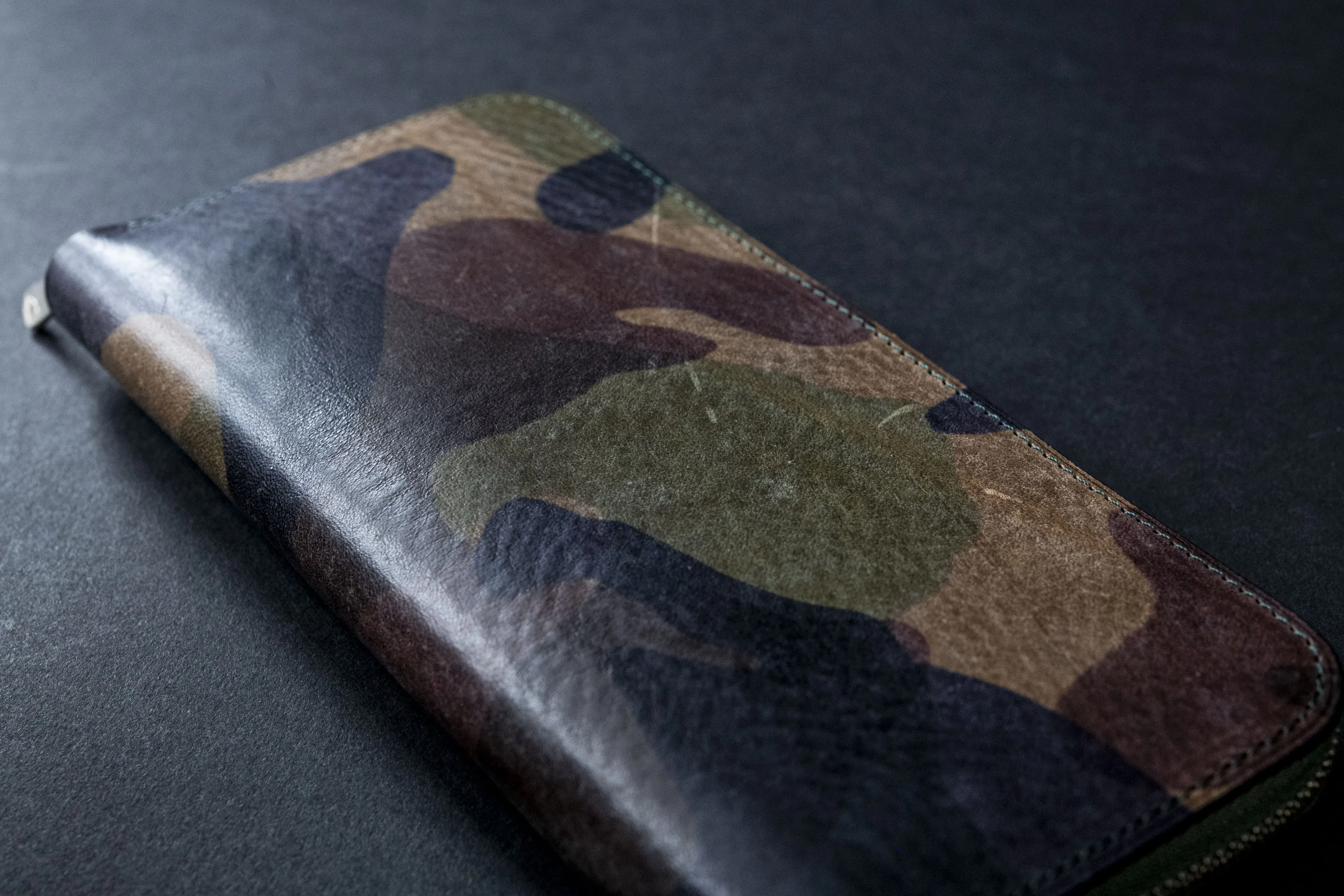 今回はイタリア・トスカーナ地方にあるフルベジタブルタンニンなめしの革のみを作るタンナー『ラ・ペルラ・アッズーラ社』のカモフラ(迷彩)柄のレザーを選びました。このカモフラ柄は一色ずつ色を重ねながら染色されている手間暇がかかるレザーです。さらにローラーをかけることでプルアップ効果と自然なツヤ感が生み出されています。本革のナチュラルさを残しつつ、ワイルドさと上品さのどちらも併せ持つレザーです。