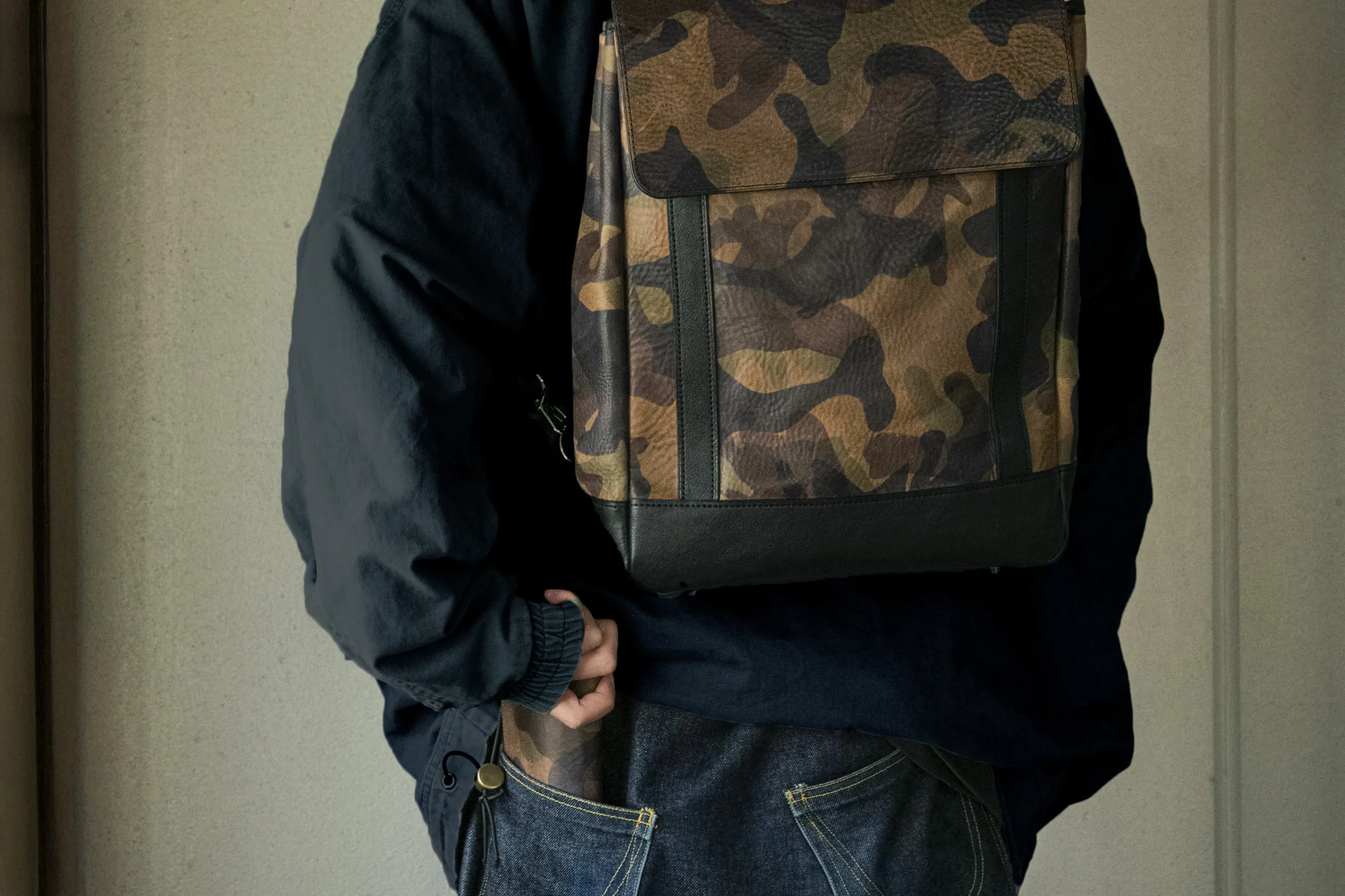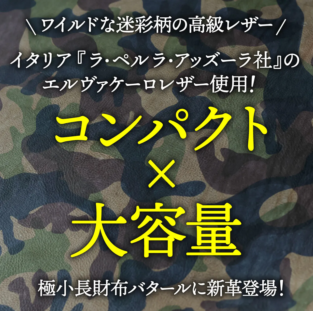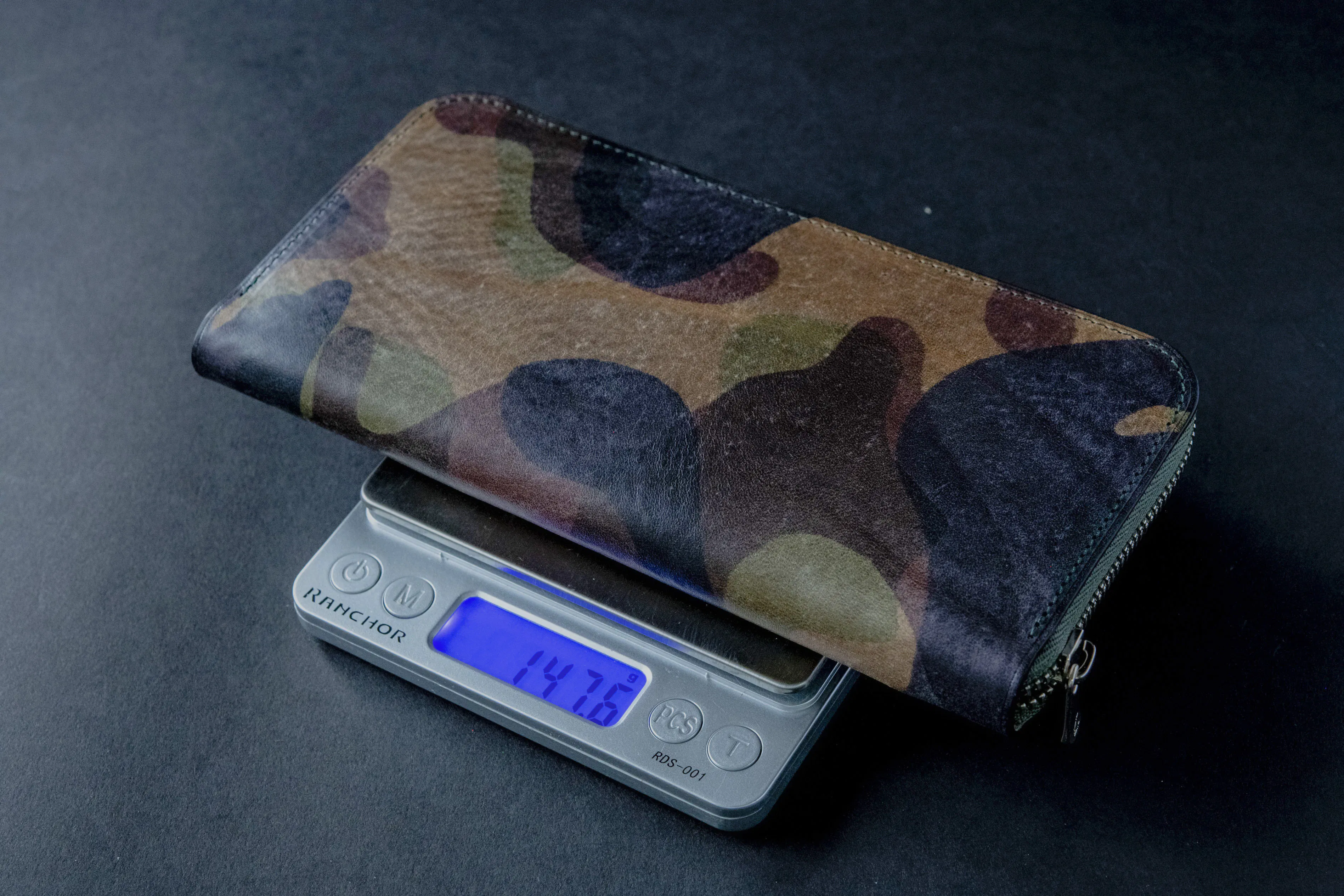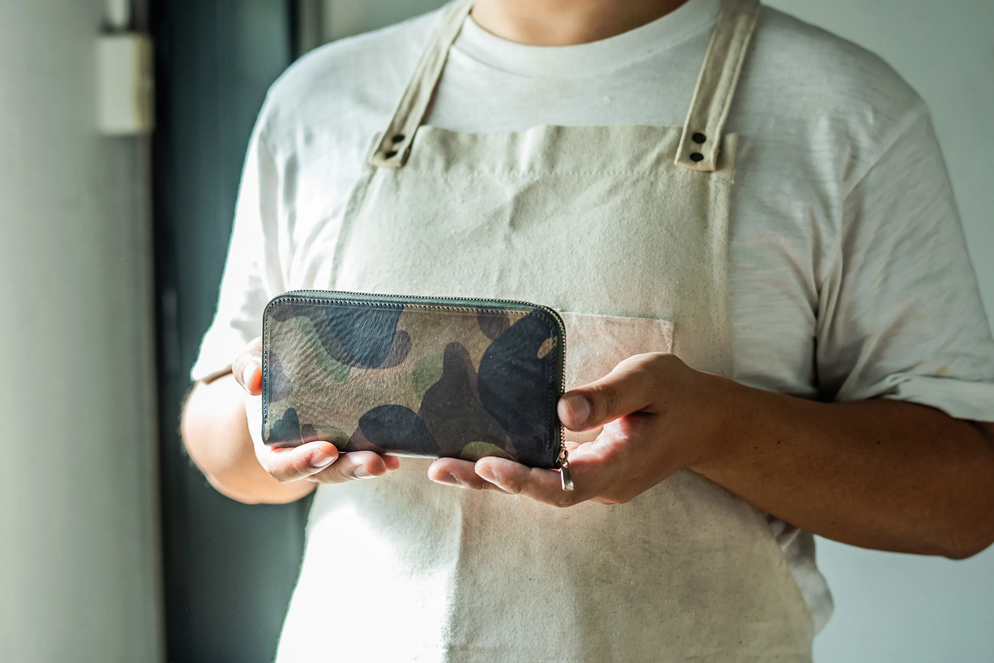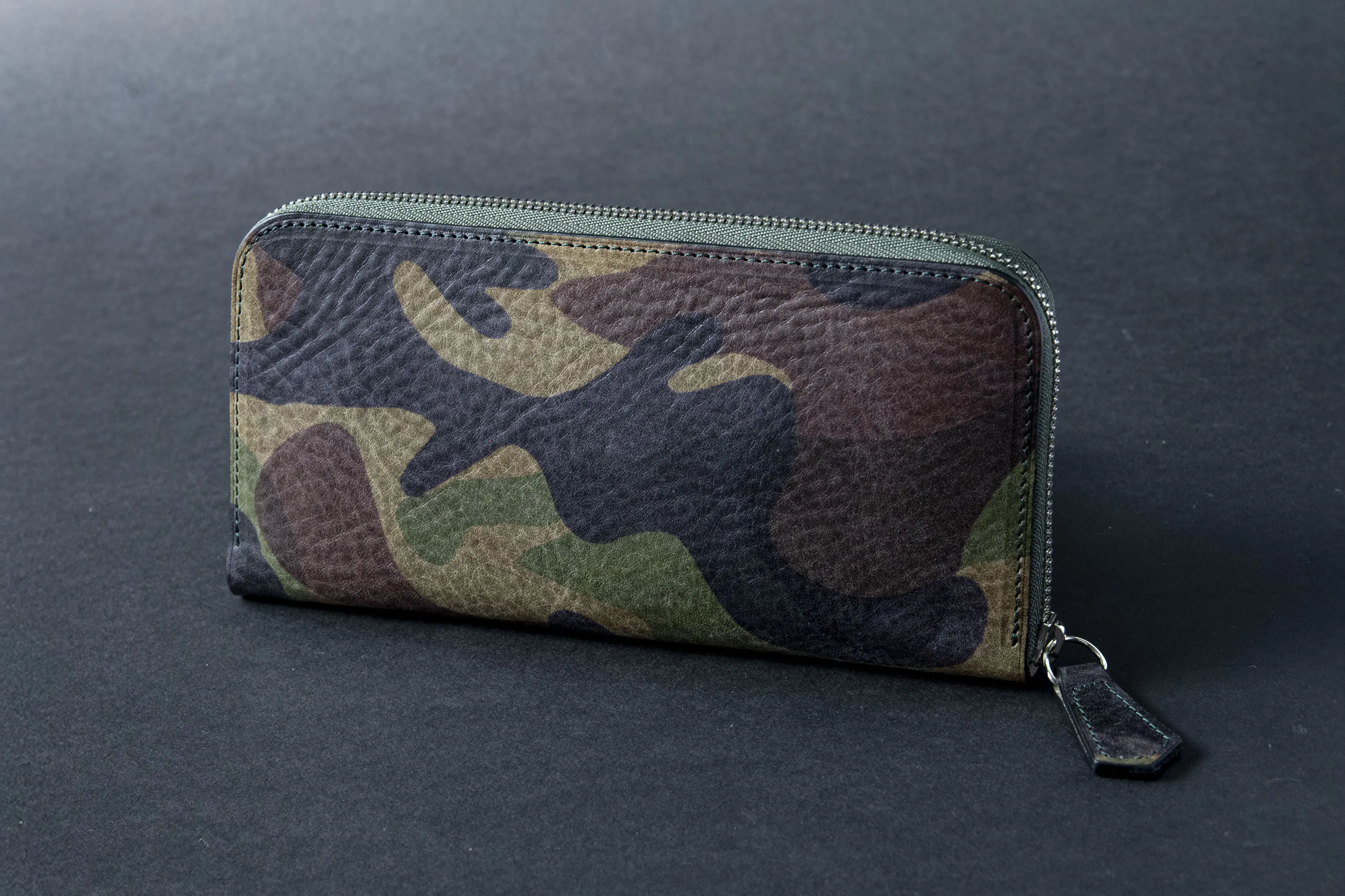 今回はイタリア・トスカーナ地方にあるフルベジタブルタンニンなめしの革のみを作るタンナー『ラ・ペルラ・アッズーラ社』のカモフラ(迷彩)柄のレザーを選びました。このカモフラ柄は一色ずつ色を重ねながら染色されている手間暇がかかるレザーです。さらにローラーをかけることでプルアップ効果と自然なツヤ感が生み出されています。本革のナチュラルさを残しつつ、ワイルドさと上品さのどちらも併せ持つレザーです。