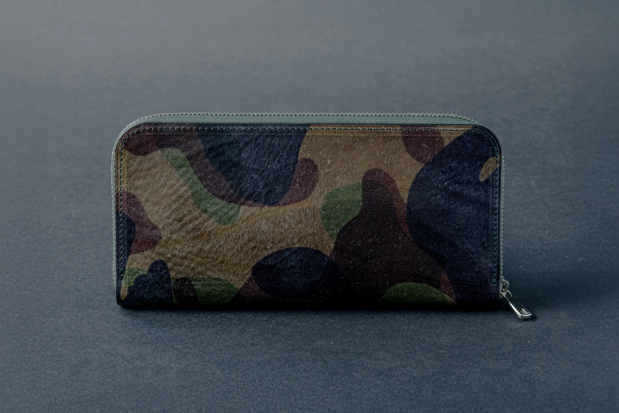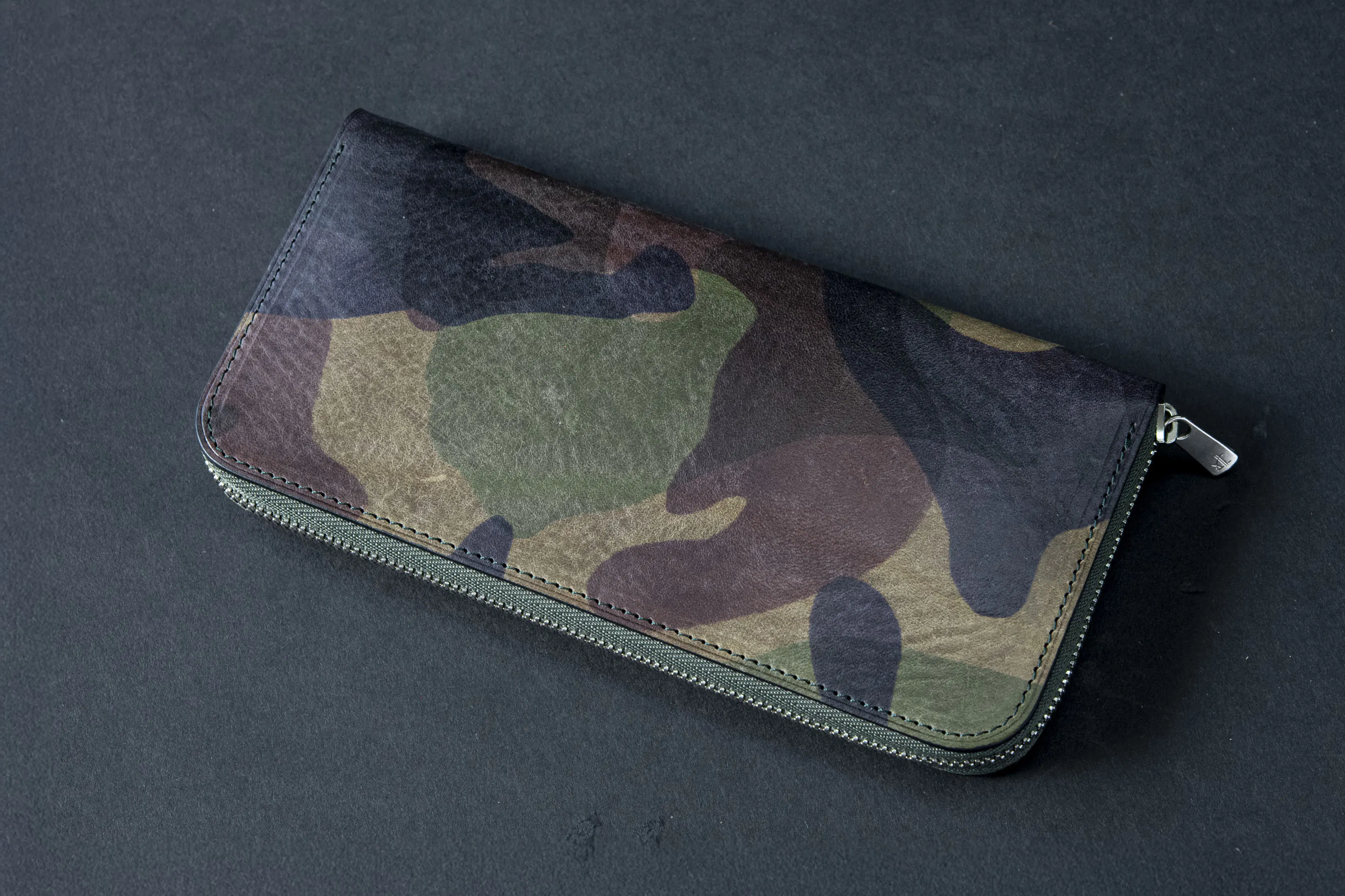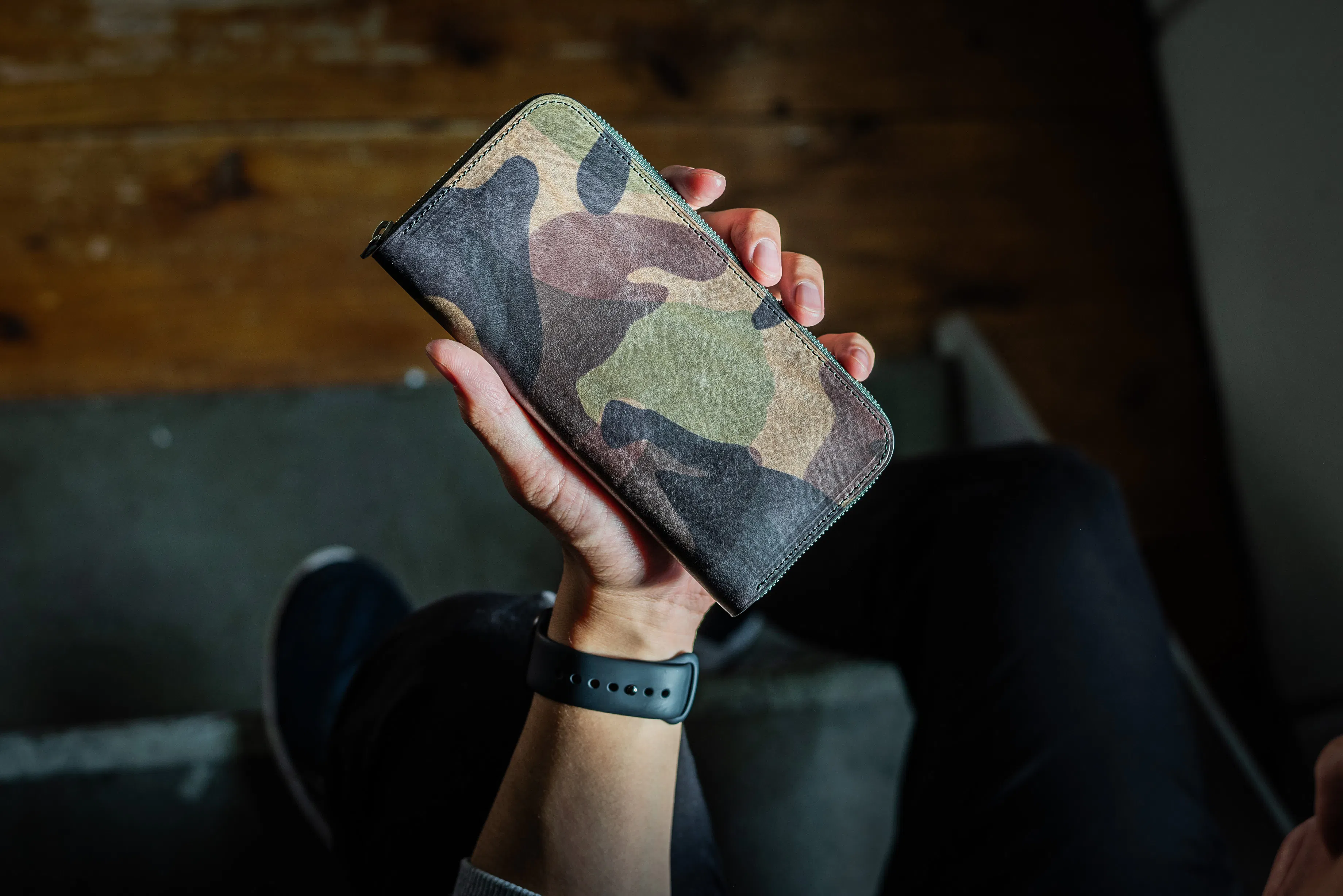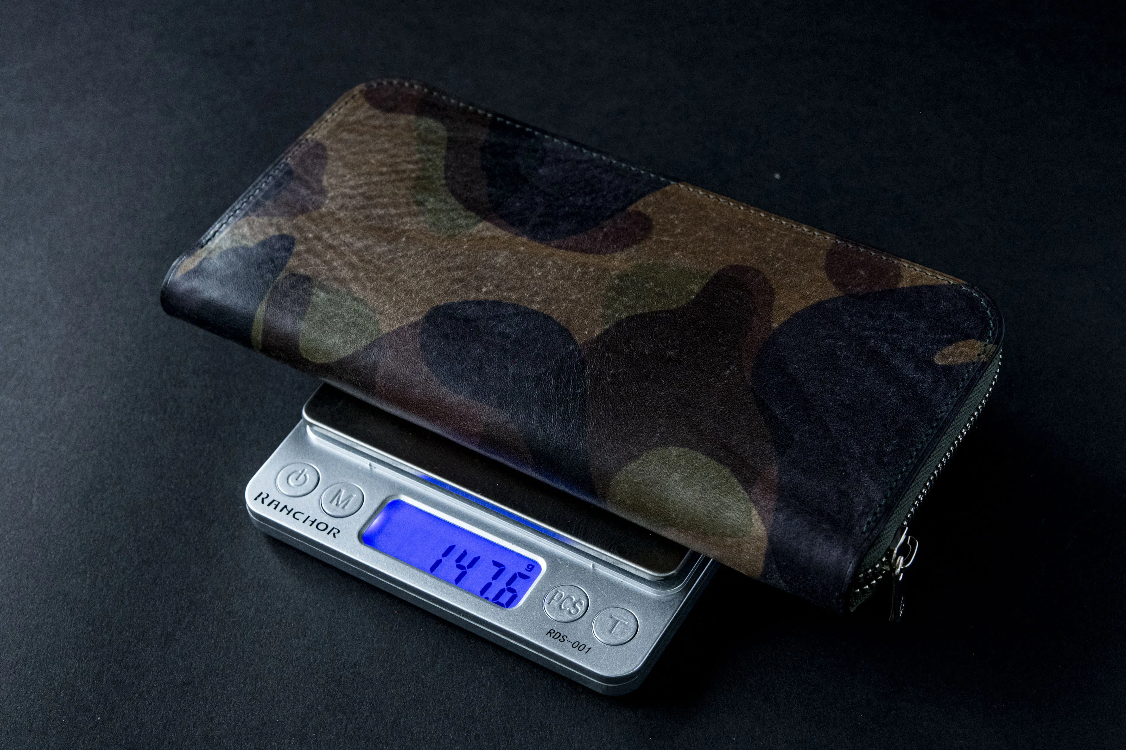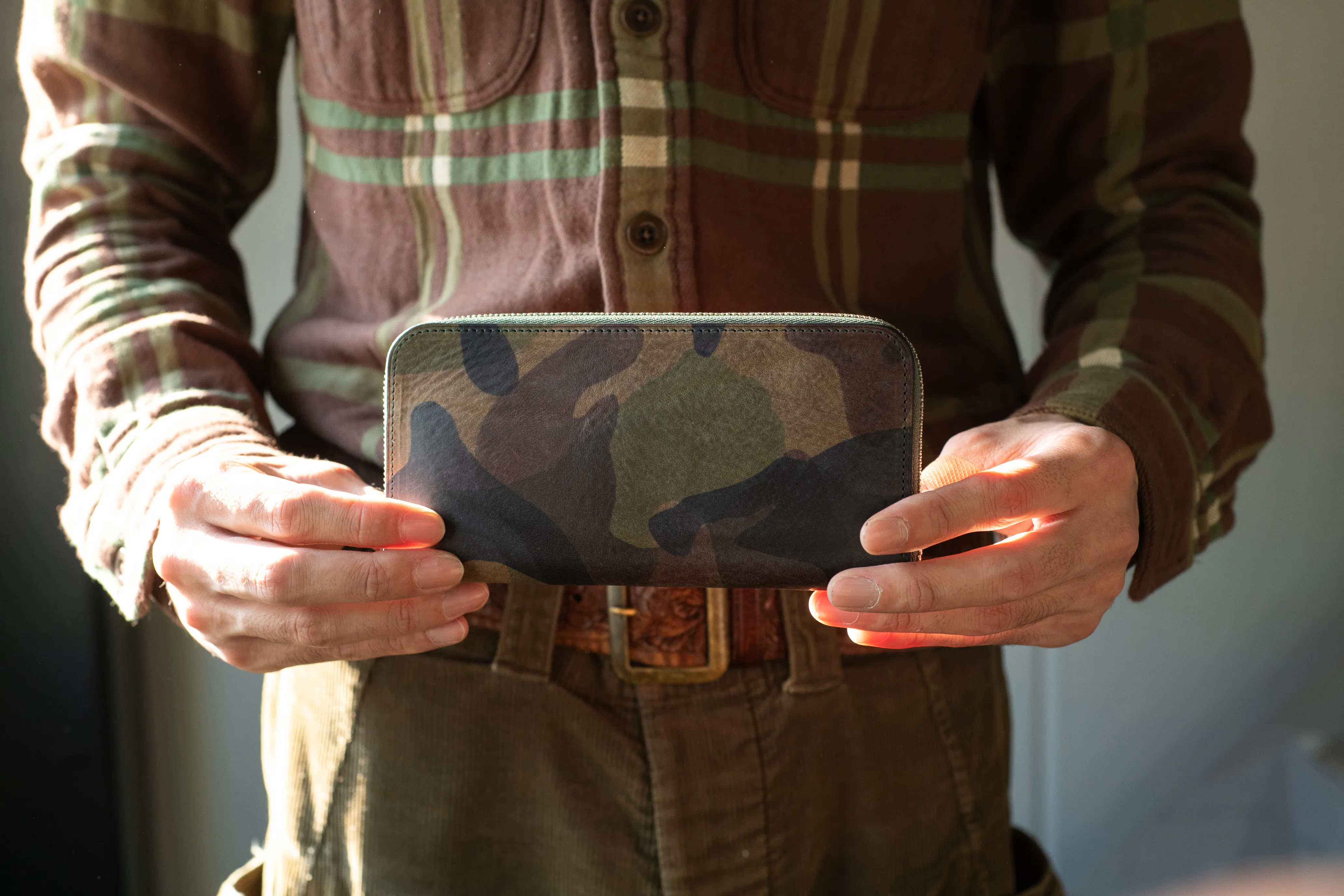今回はイタリア・トスカーナ地方にあるフルベジタブルタンニンなめしの革のみを作るタンナー『ラ・ペルラ・アッズーラ社』のカモフラ(迷彩)柄のレザーを選びました。このカモフラ柄は一色ずつ色を重ねながら染色されている手間暇がかかるレザーです。さらにローラーをかけることでプルアップ効果と自然なツヤ感が生み出されています。本革のナチュラルさを残しつつ、ワイルドさと上品さのどちらも併せ持つレザーです。