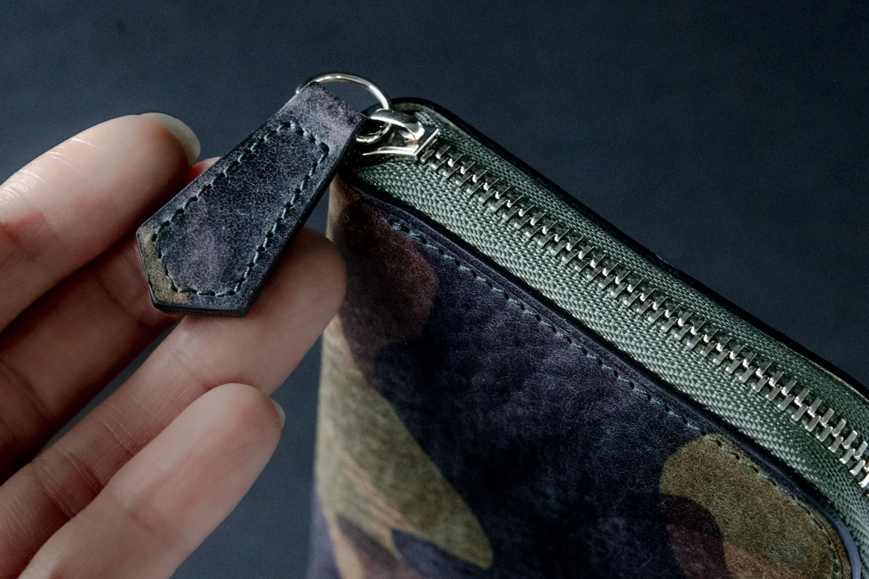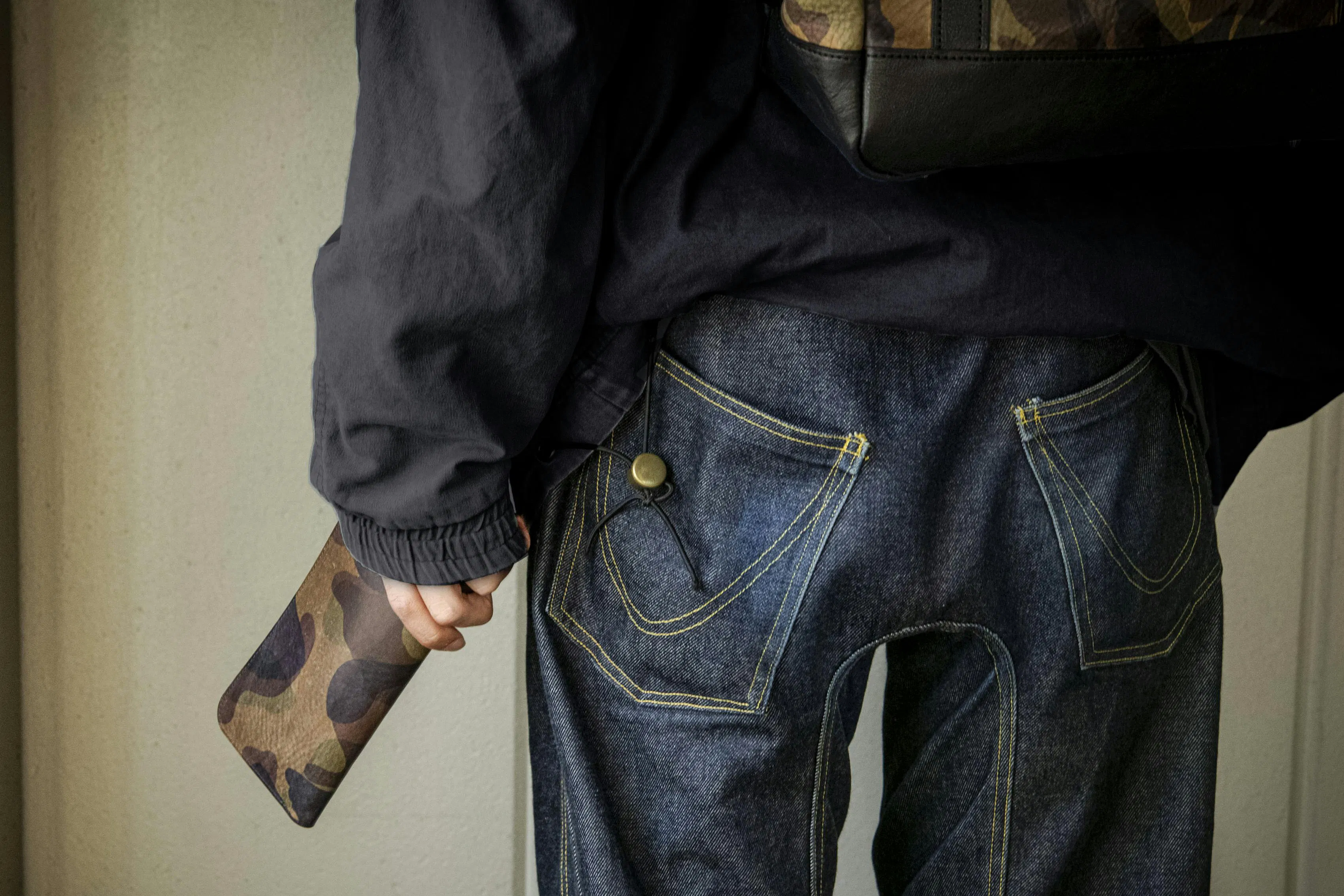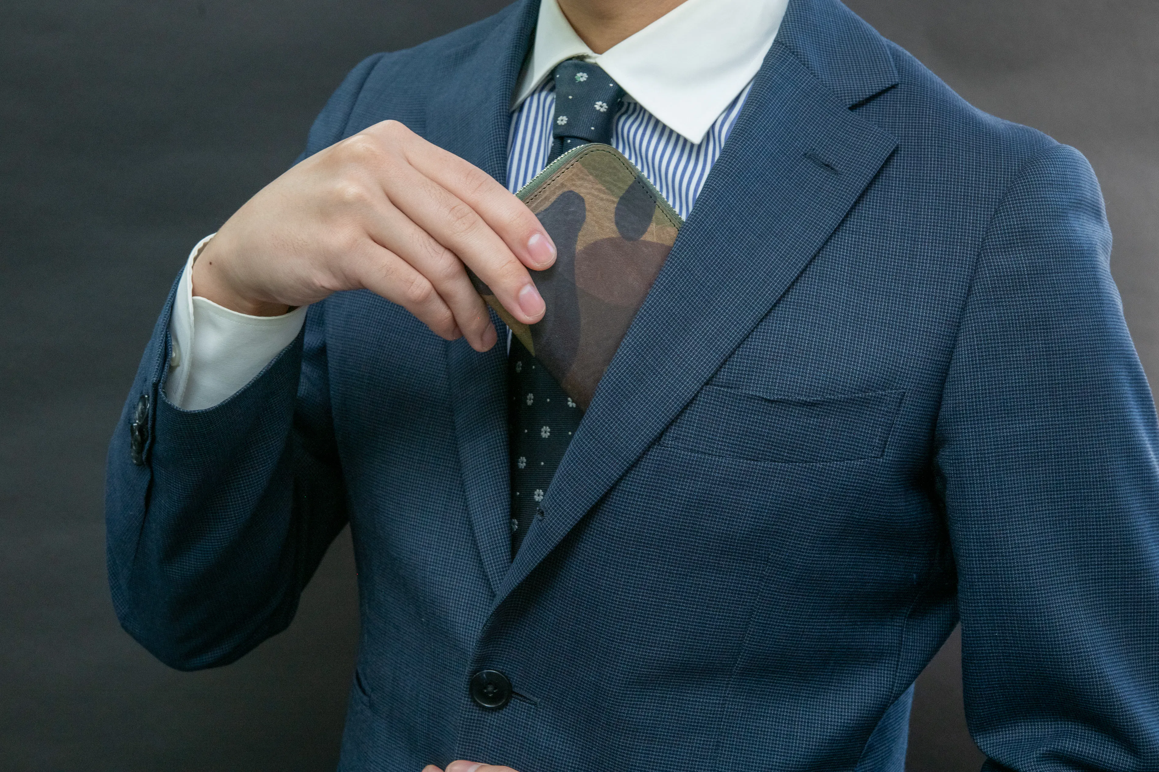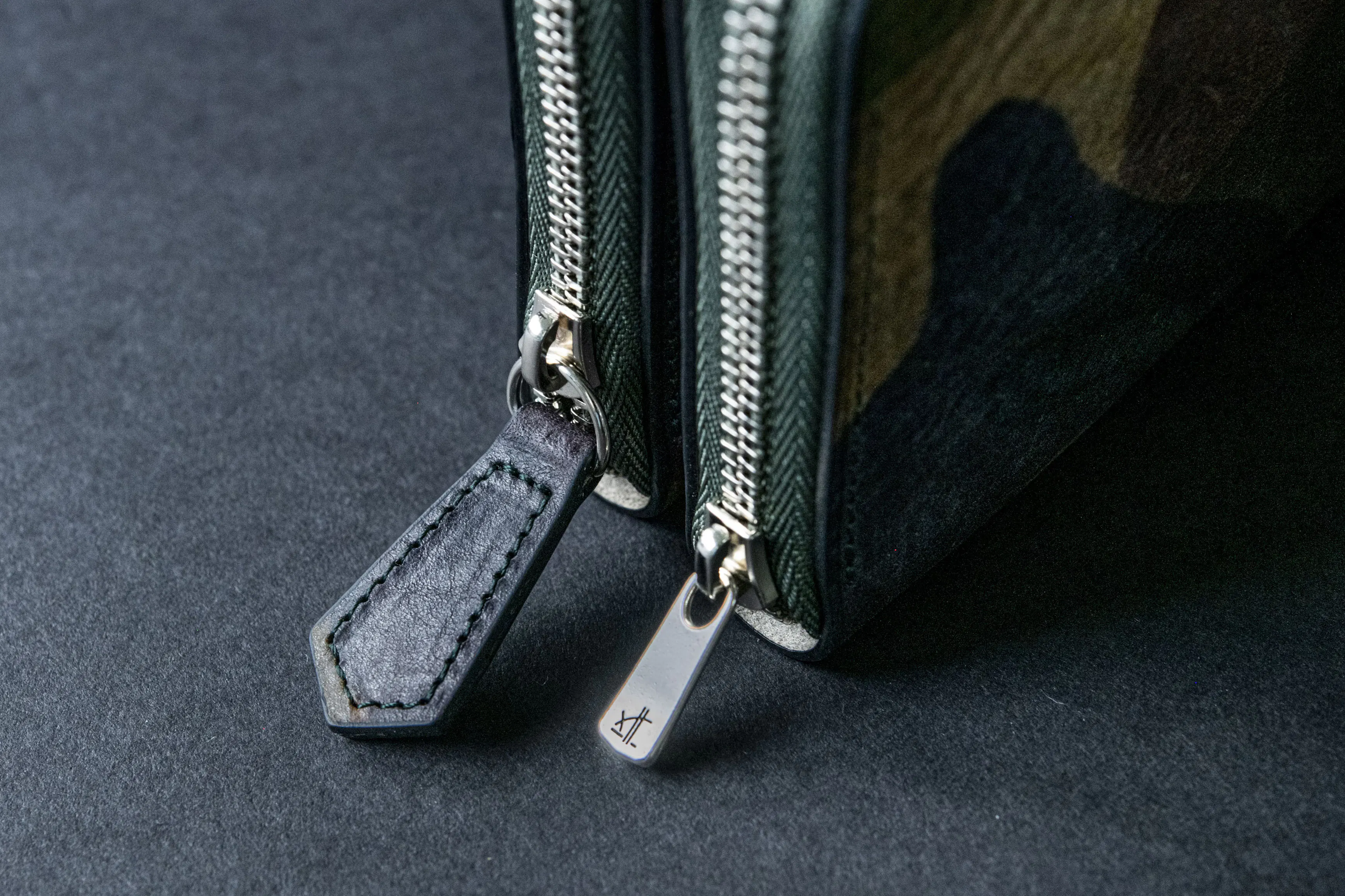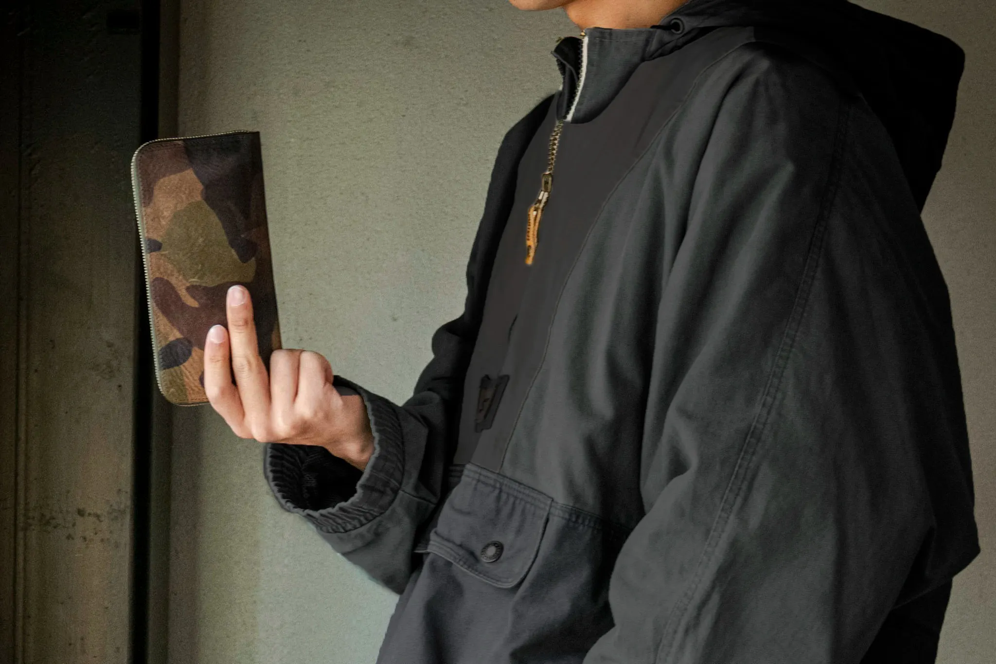 今回はイタリア・トスカーナ地方にあるフルベジタブルタンニンなめしの革のみを作るタンナー『ラ・ペルラ・アッズーラ社』のカモフラ(迷彩)柄のレザーを選びました。このカモフラ柄は一色ずつ色を重ねながら染色されている手間暇がかかるレザーです。さらにローラーをかけることでプルアップ効果と自然なツヤ感が生み出されています。本革のナチュラルさを残しつつ、ワイルドさと上品さのどちらも併せ持つレザーです。
