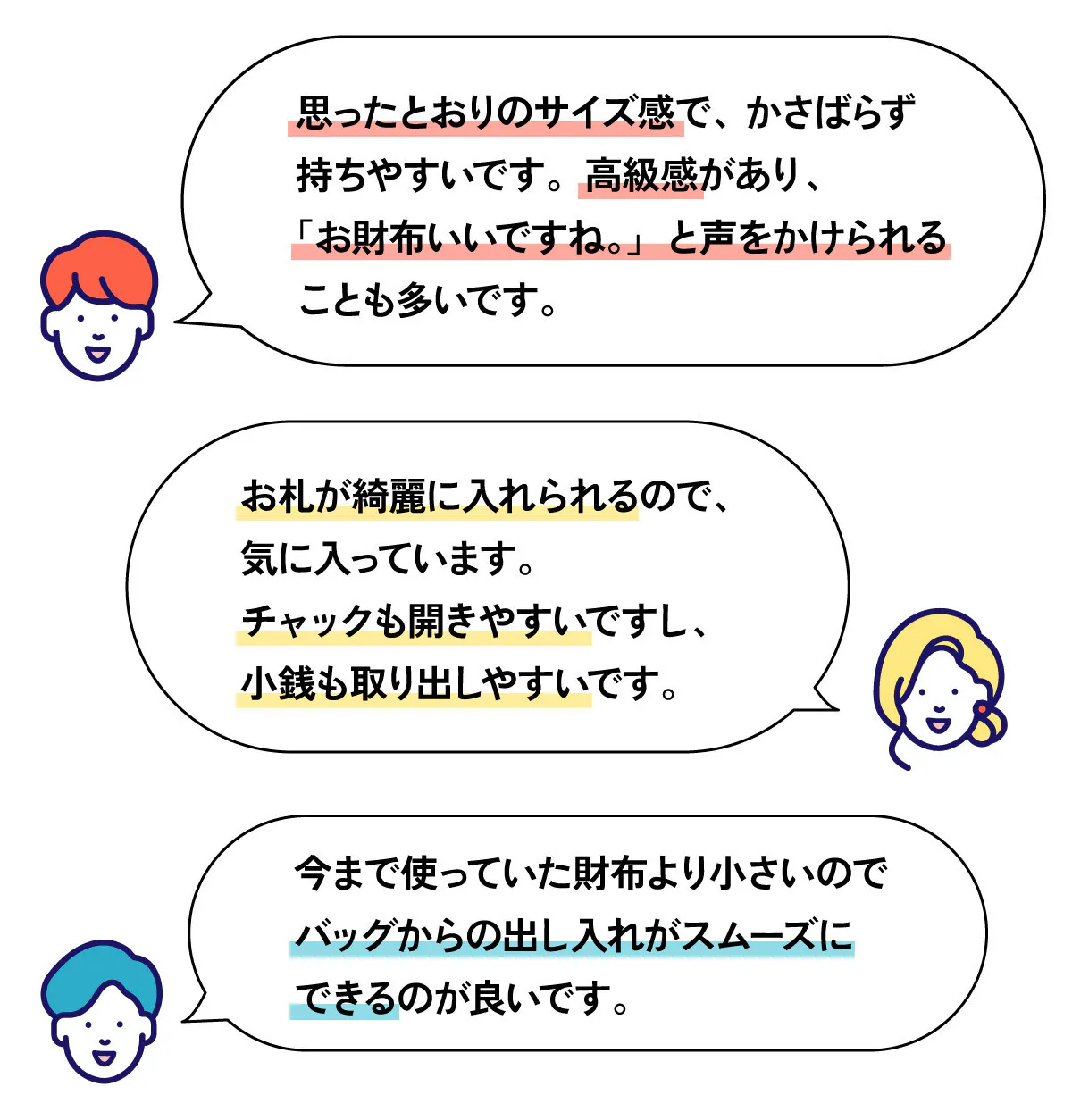 小銭入れを小さくし、マチのパーツも小さくすることで、お札の角にマチが接することなくスマートに収納できるようになりました。