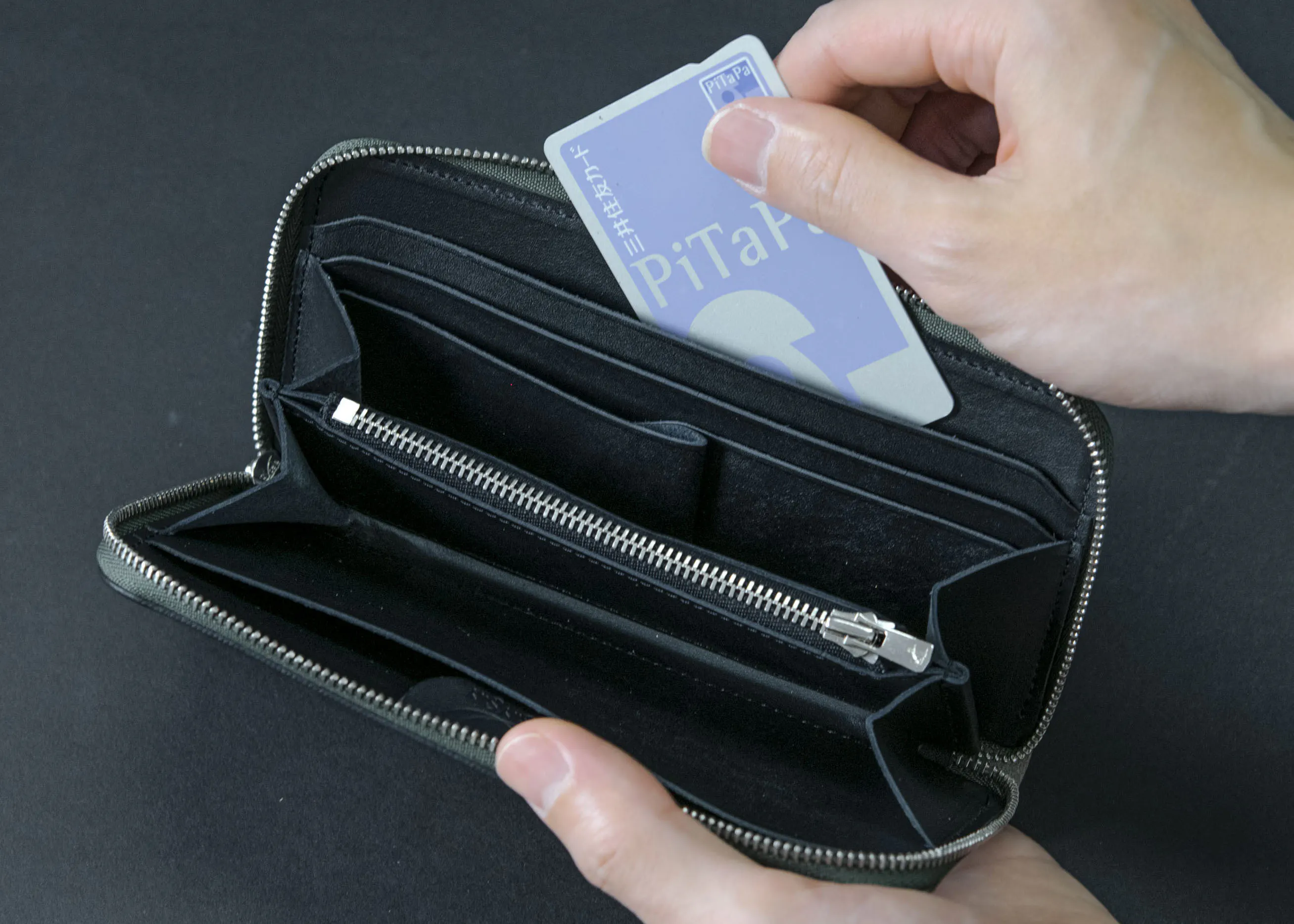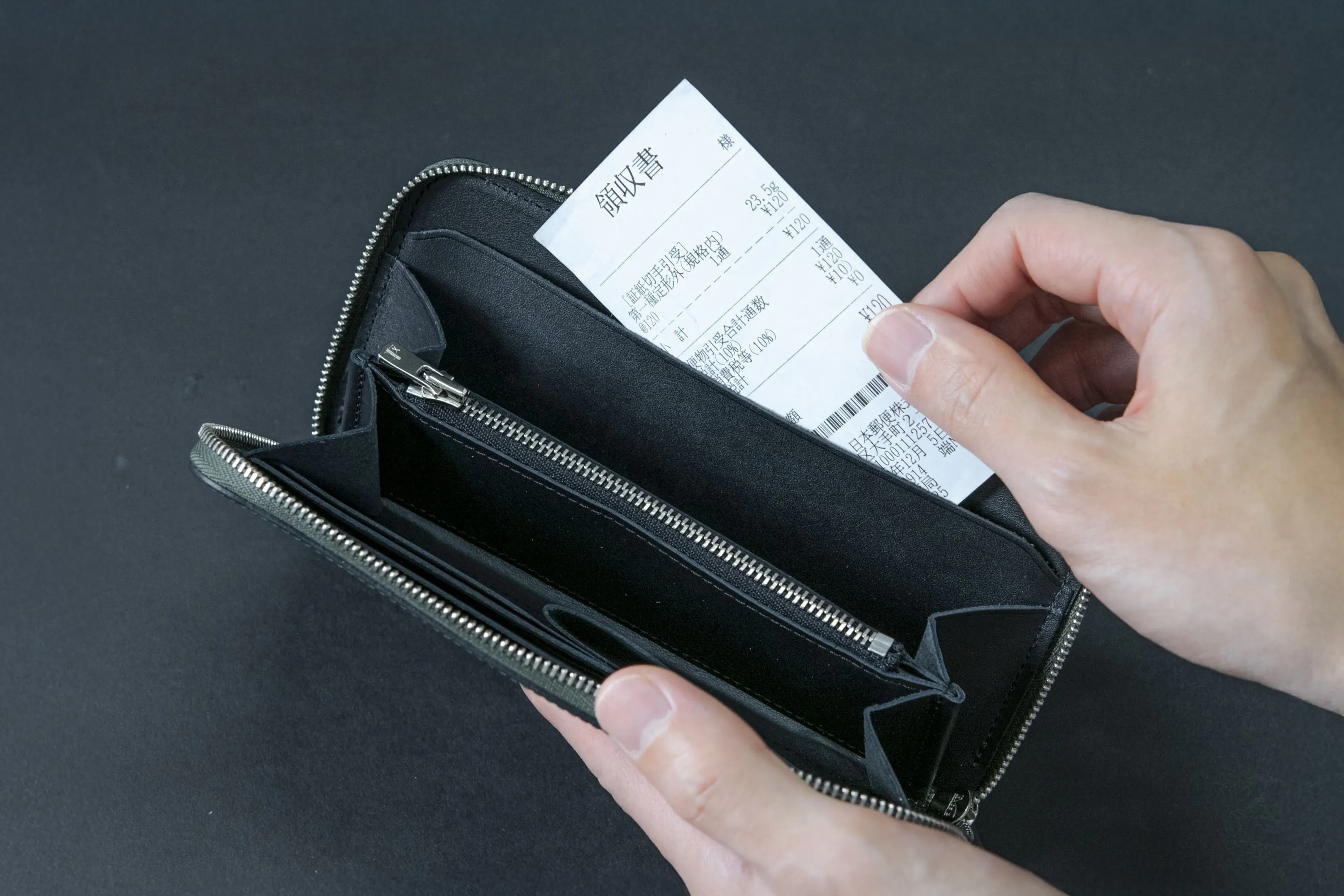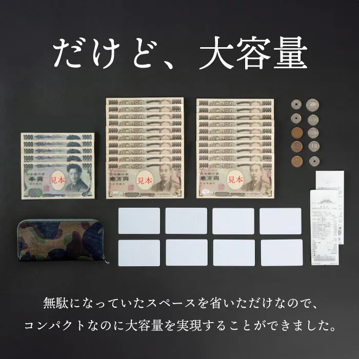 長財布の魅力はなんといっても収納力。従来のラウンドジップ長財布では無駄になっていたスペースを削ることで、コンパクトなのに大容量を実現しました。